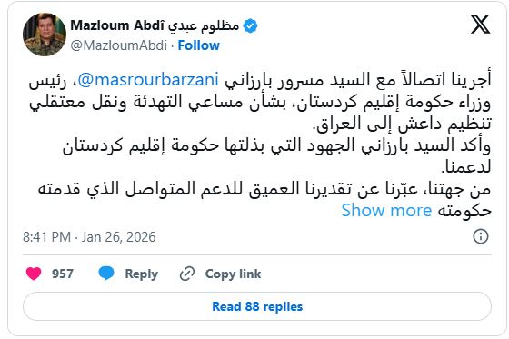 كشف القائد العام لقوات سوريا الديمقراطية (قسد) عن مضون مكالمته الهاتفية مع رئيس حكومة اقليم كردستان مسرور بارزاني.