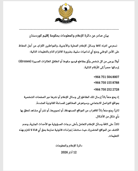 دعت دائرة الإعلام والمعلومات التابعة لحكومة اقليم كردستان في بيان لها اليوم الخميس، المواطنين ووسائل الإعلام المختلفة إلى الالتزام بالتعليمات الصادرة عنها.