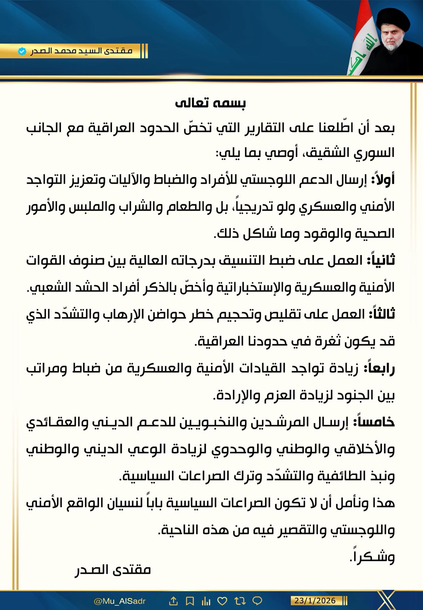 مقتدى الصدر يدعو الى ارسال الدعم اللوجستي والطعام الى الحدود العراقية