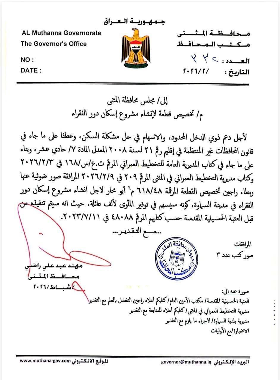 صوت مجلس محافظة المثنى على طلب تخصيص قطعة ارض لانشاء مشروع لاسكان (1000) عائلة متعففة.