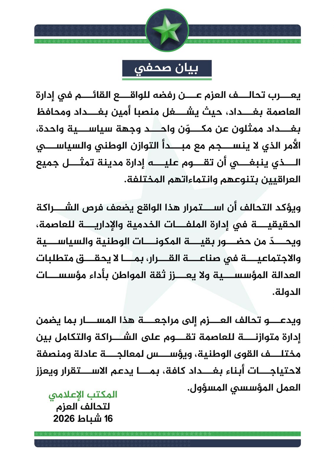 طالب تحالف العزم بتغيير اما محافظ بغداد او امين بغداد، بسبب انتماء الاثنين للاطار التنسيقي فقط وغياب جهات سياسية اخرى.