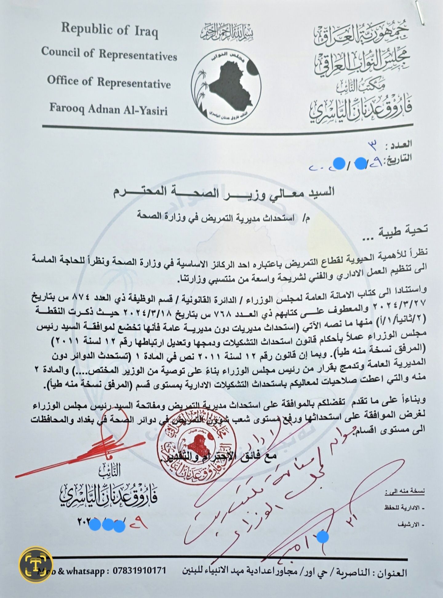 وافق وزير الصحة على استحداث مديرية التمريض في مركز وزارة الصحة ويفاتح رئيس مجلس الوزراء بخصوص استحداث المديرية ورفع مستوى شعب التمريض في دوائر الصحة في بغداد والمحافظات الى اقسام ، حسبما اعلنه النائب فاروق عدنان الياسري.