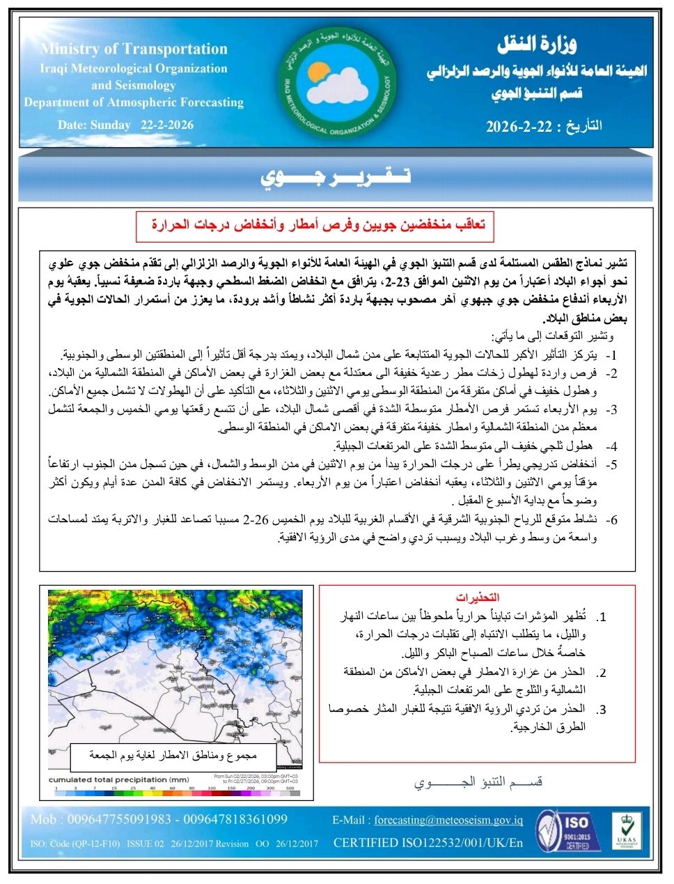توقع قسم التنبؤ الجوي، زخات مطر تتركز شمال البلاد ، وانخفاض درجات الحرارة في كافة المدن بتفاوت ، وعودة تساقط الثلوج على المرتفعات الجبلية.