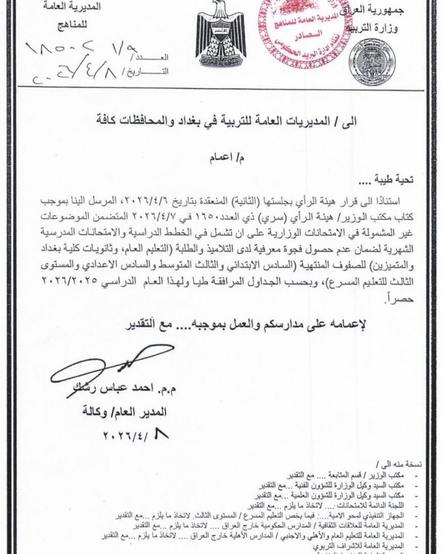 أعلن المكتب الإعلامي في وزارة التربية جداول الموضوعات غير المشمولة بالامتحانات الوزارية للعام الدراسي 2025–2026، الخاصة بالصفوف المنتهية (السادس الابتدائي، الثالث المتوسط، السادس الإعدادي، والمستوى الثالث للتعليم المسرّع)، ولطلبة التعليم العام وثانويات كلية بغداد والمتميزين.