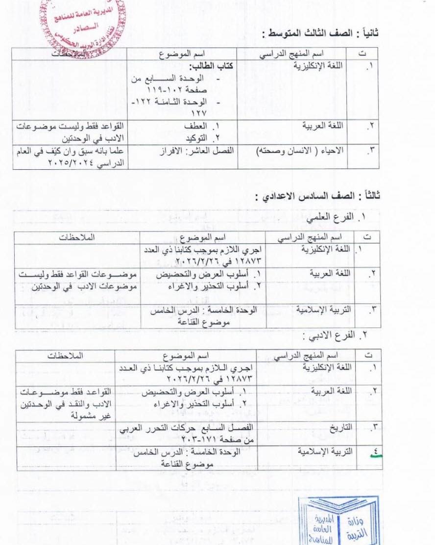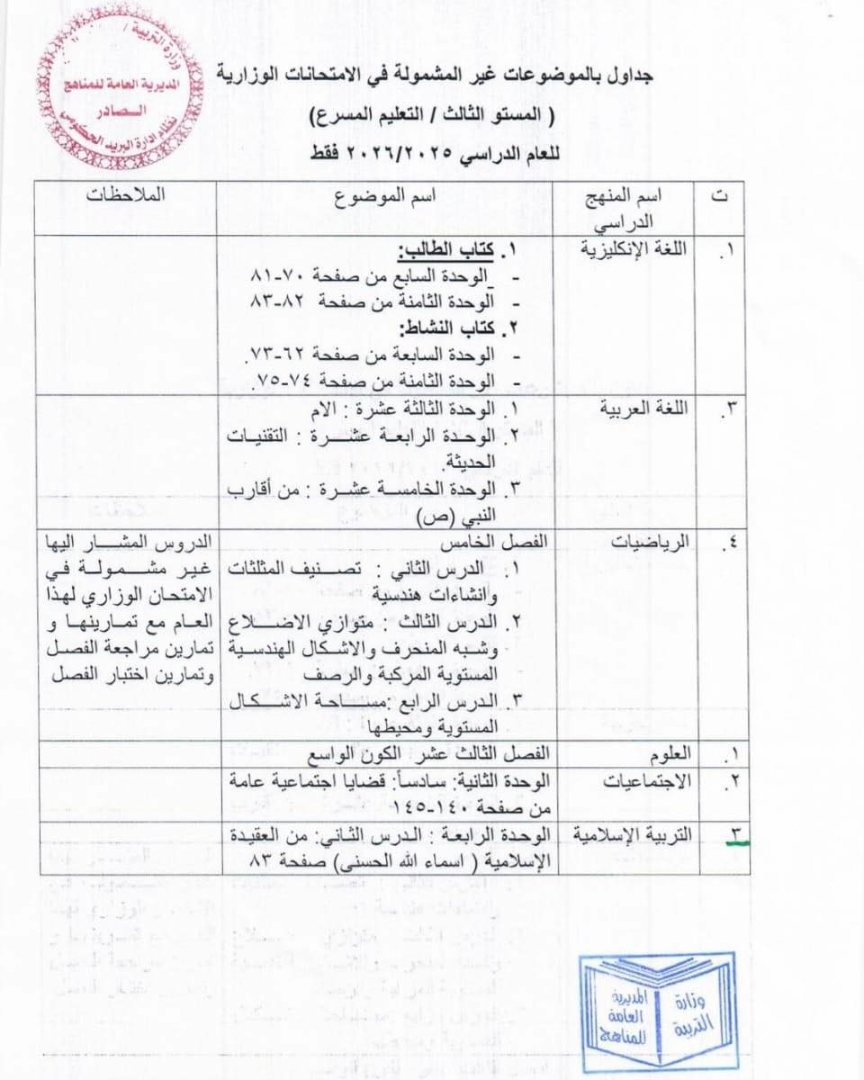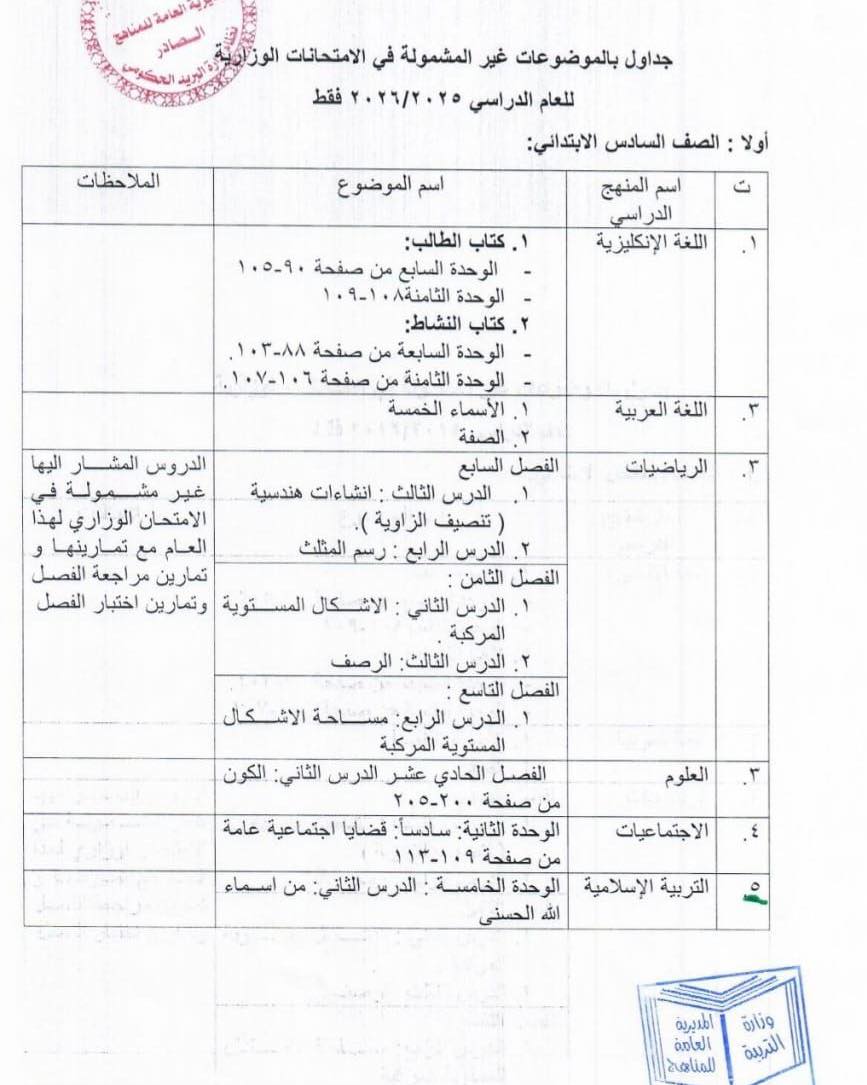 وأوضح أن الجداول المرافقة تتضمن تفاصيل المواد المستثناة ويُعمل بها لهذا العام الدراسي حصراً.