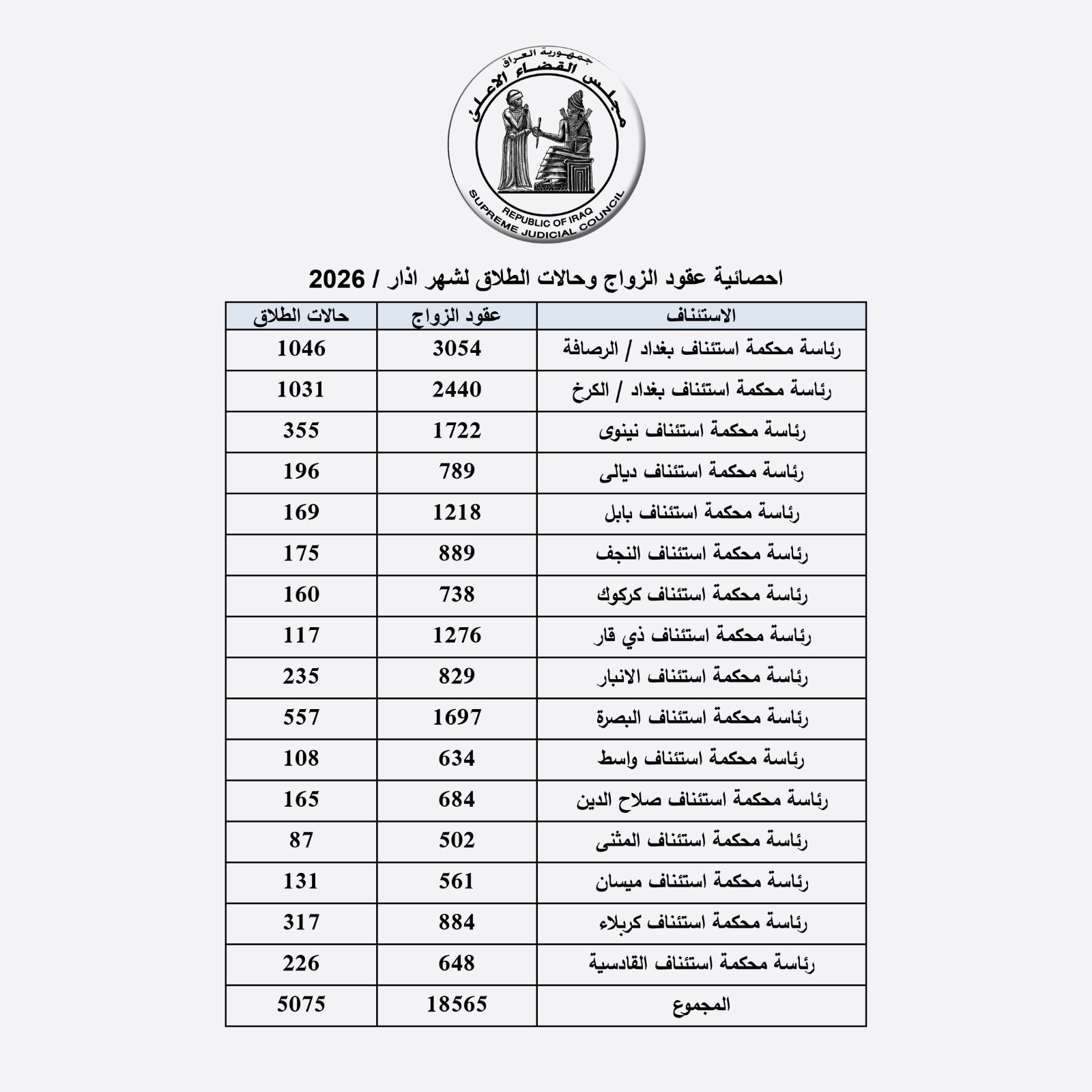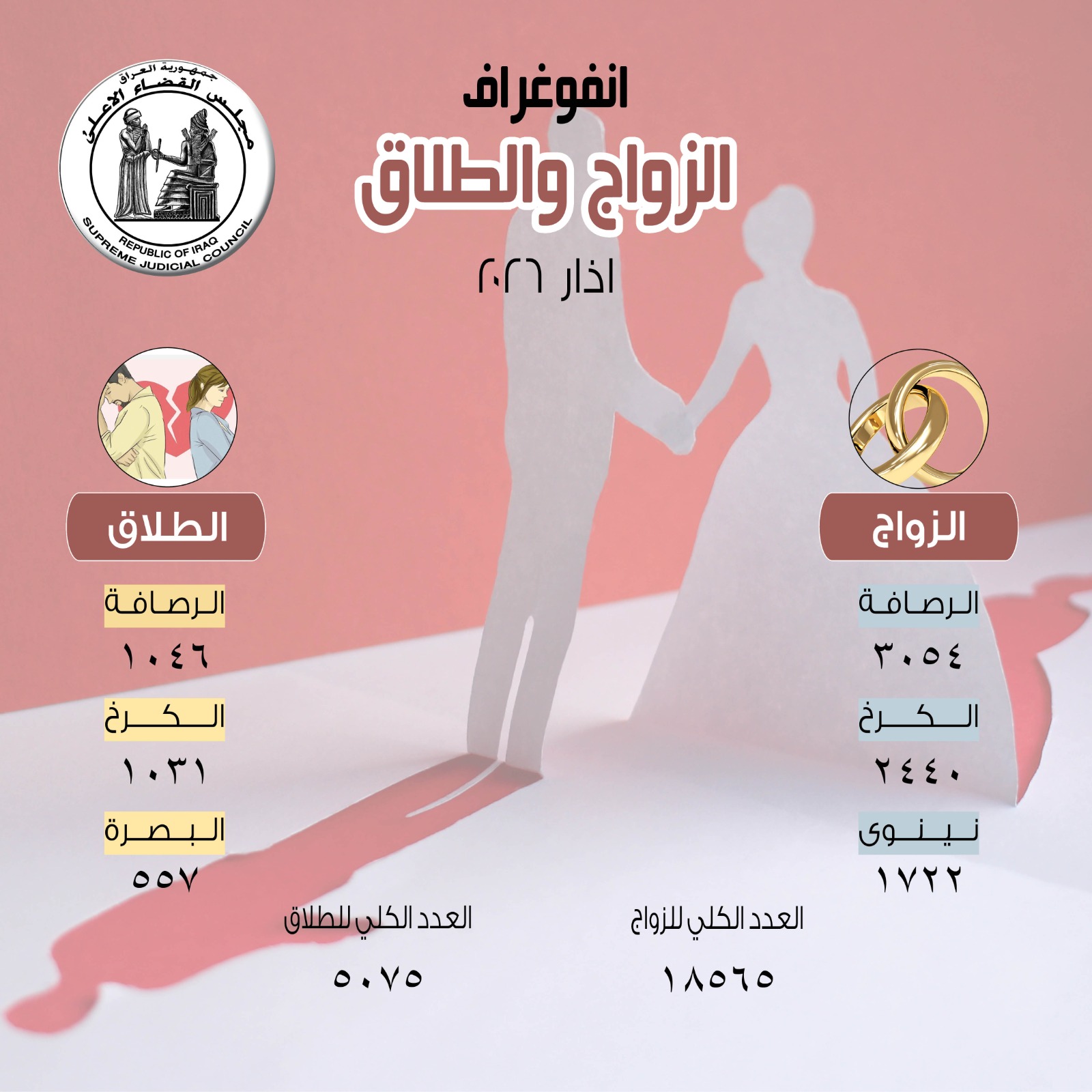 مجلس القضاء الاعلى: إحصائية الزواج والطلاق لشهر آذار لسنة 2026