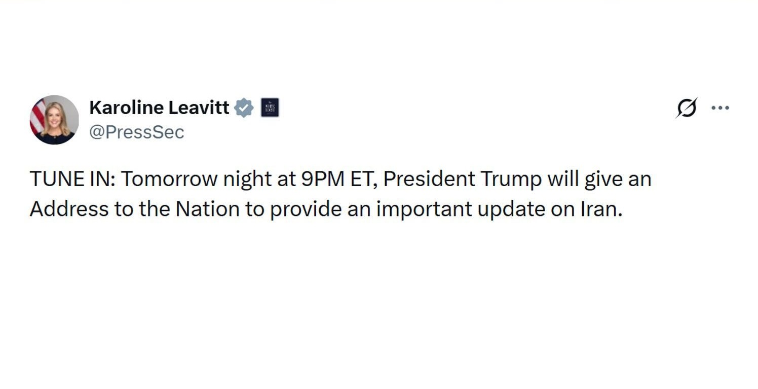 وقالت المتحدثة باسم البيت الأبيض كارولين ليفيت في منشور مختصر على منصة إكس: "ترقبوا... في الساعة 9:00 صباحًا بتوقيت الساحل الشرقي للولايات المتحدة، سيتحدث الرئيس ترامب إلى الشعب ليقدم تطورًا كبيرًا بشأن إيران".