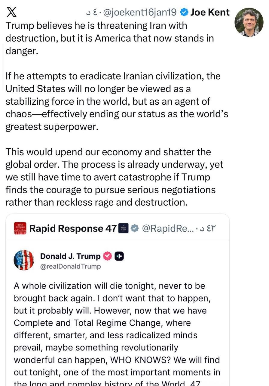 -إذا حاول القضاء على الحضارة الإيرانية، فلن يُنظر إلى الولايات المتحدة بعد الآن على أنها قوة استقرار في العالم، بل كعامل للفوضى، مما سيؤدي فعلياً إلى إنهاء مكانتنا كأعظم قوة عظمى في العالم.