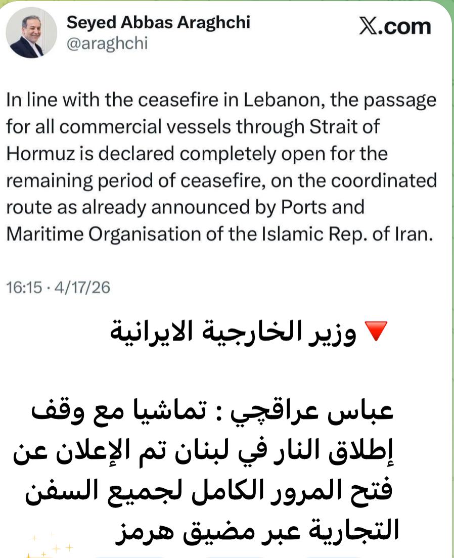 أعلن وزير الخارجية الإيراني عباس عراقجي اليوم الجمعة أن مضيق هرمز بات مفتوحا كليا أمام جميع السفن التجارية طوال الفترة المتبقية من وقف إطلاق النار، وذلك تماشيا مع وقف إطلاق النار في لبنان.