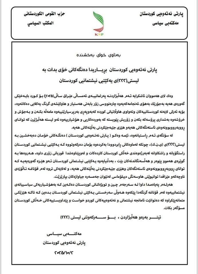 لە راگەیەندراوێکدا پارتی نەتەوەیی کوردستان ئاشکرای کرد بۆ هەڵبژاردنی پەرلەمانی عێراق کە بڕیارە لە 11ی تشرینی دووەمی ئەمساڵ بەڕێوەبچێت دەنگەکانی خۆی بداتە یەکێتیی نیشتمانیی کوردستان.
