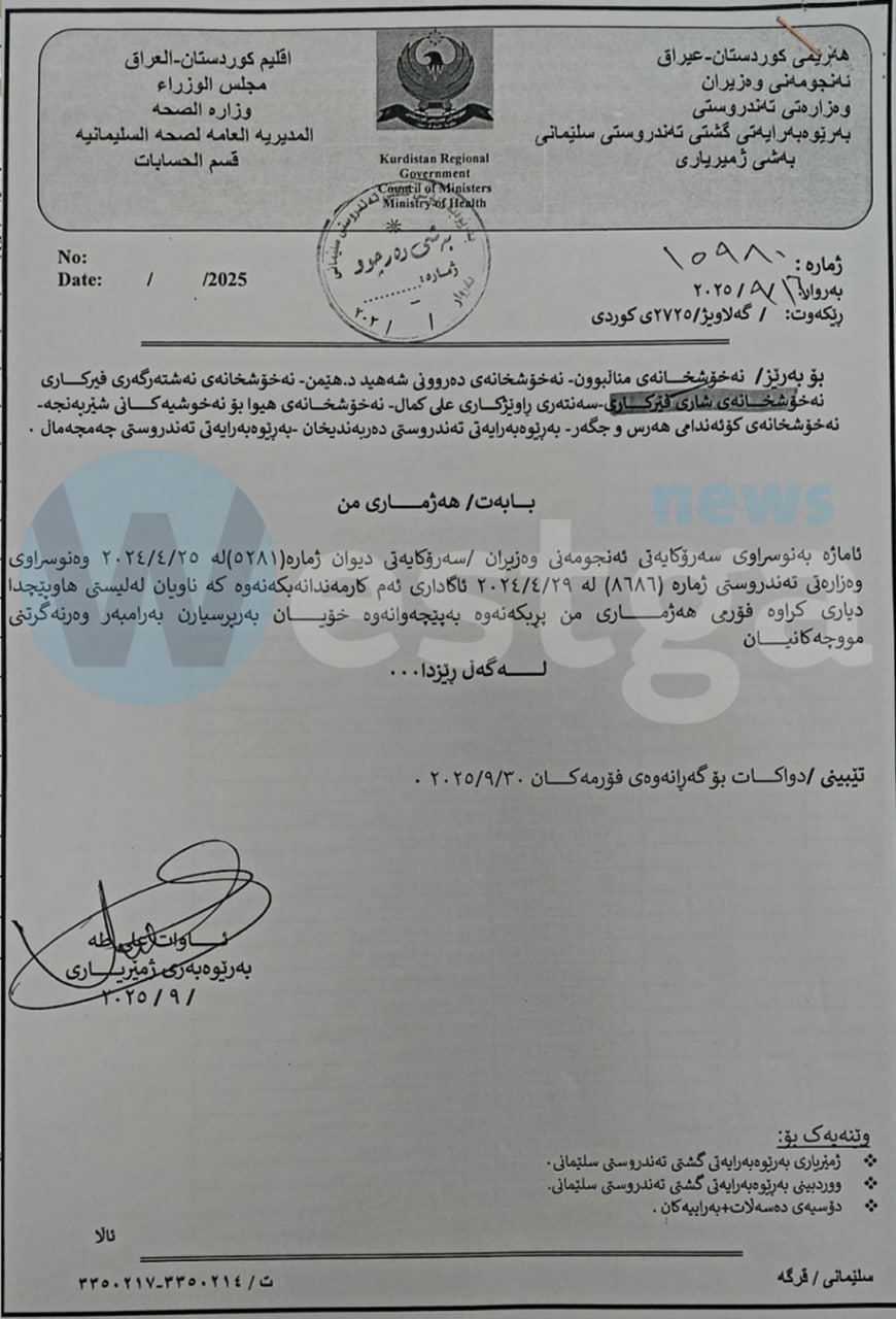 له نووسراوی یهكهمدا كه رۆژی 16ی ئهیلولی 2025 ئاراستهی نهخۆشخانهكانی (مناڵبوون، دهروونی شههید د.هێمن، نهشتهرگهری فێركاری، شاری فێركاری، سهنتهری راوێژكاری عهلی كهمال، هیوا بۆ نهخۆشییهكانی شێرپهنجه، كۆئهندامی ههرس و جگهر) و بهڕێوهبهرایهتییهكانی تهندروستی دهربهندیخان و چهمچهماڵ كراوه، داواكراوه پزیشكان و فهرمانبهران فۆڕمی (ههژماری من) پڕبكهنهوه، هۆشداریش دراوه لهوهی بهپێچهوانهوه خۆیان بهرپرسیار دهبن بهرامبهر وهرنهگرتنی مووچهكانیان.