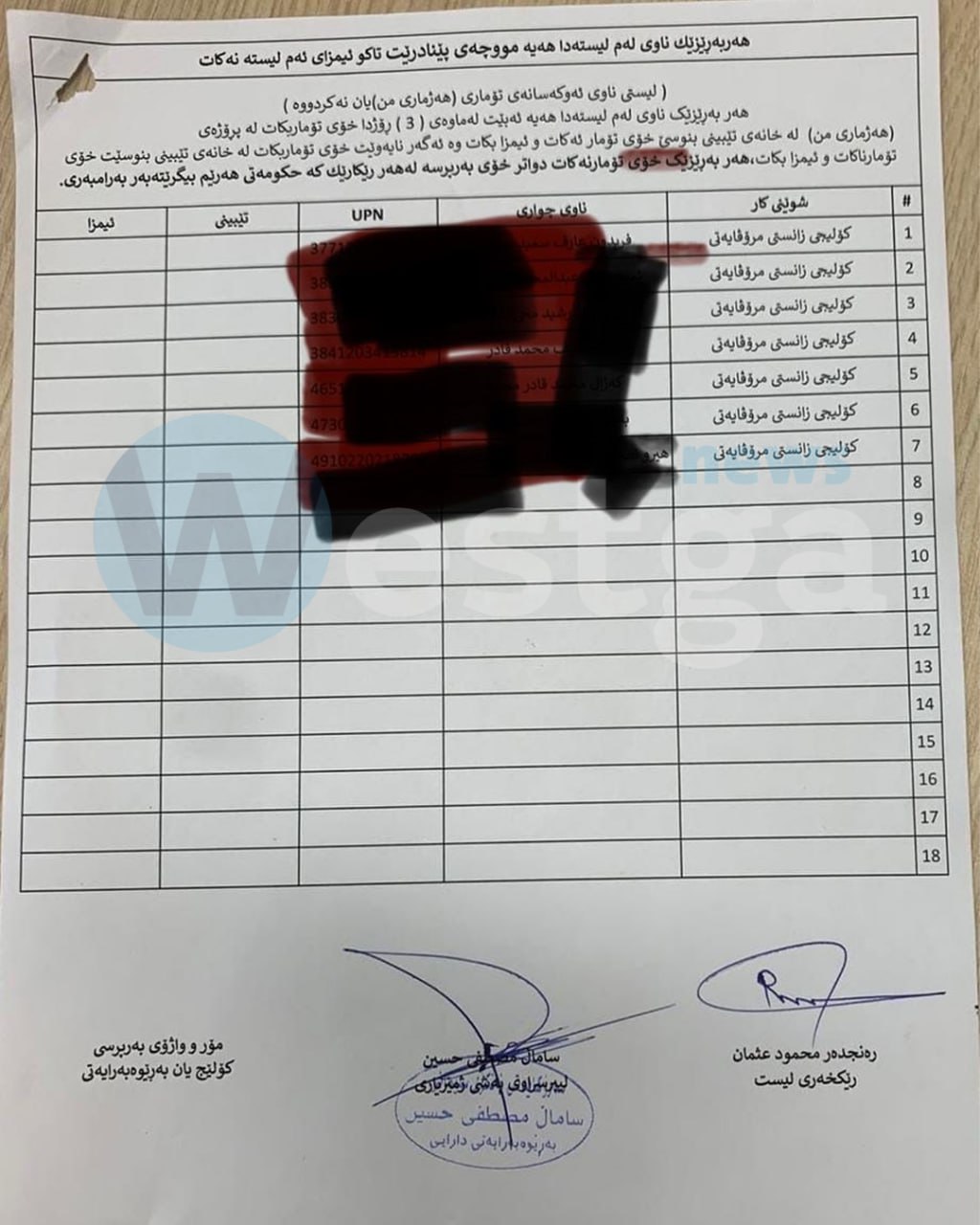 له نووسراوهكهی زانكۆی سلێمانیشدا 7 مامۆستای كۆلیجی زانستی مرۆڤایهتی ئاگادار كراونهتهوه له ماوهی 3 رۆژدا خۆیان له پرۆژهی (ههژماری من) تۆمار بكهن. بهپێچهوانهشهوه دواتر خۆیان بهرپرس دهبن له ههر رێكارێك كه حكومهتی ههرێم بهرامبهریان بیگرێتهبهر.