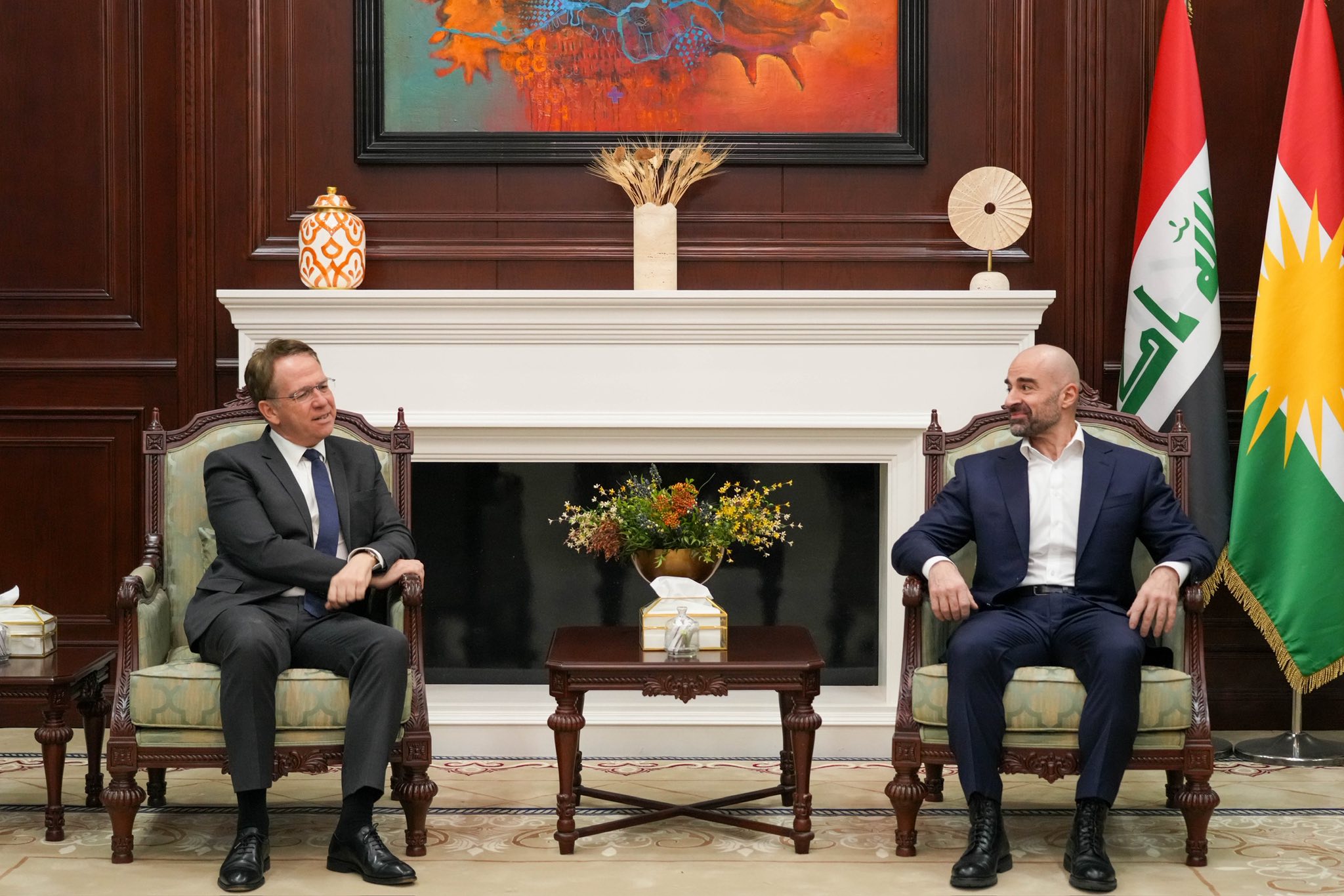 بافڵ تاڵهبانی، سهرۆكی یهكێتیی نیشتمانیی كوردستان له بارهگای مهكتهبی سیاسی له ههولێر پێشوازی له پاتریك دۆرێڵ، باڵیۆزی فهرهنسا له عیراق كرد.