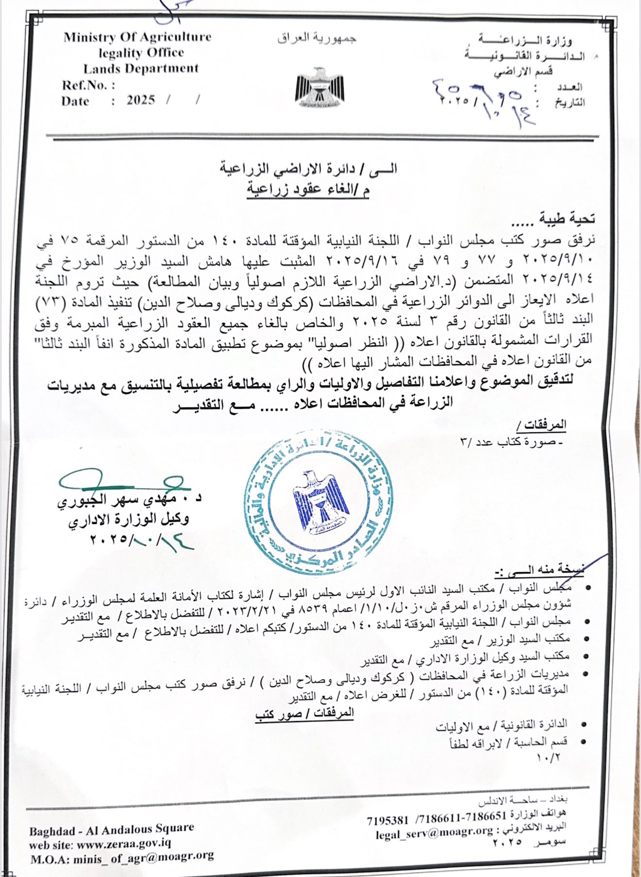 جێگیر سەرۆکی پەرلەمانی عێراق دەڵێت: "دوای گەیشتنی زانیاری بەوەی بەڕێوەبەری کشتوکاڵی کەرکووک تاوەکو ئێستا گرێبەستی عەرەبی هاوردە نوێدەکاتەوە سێ نوسراومان ئاراستەی وەزیری کشتوکاڵ کرد و ئەویش لەسەر ئەو بابەتە ئاگاداری کەرکوک و دیاله و سهڵاحهدین کردەوە کە لێکۆڵینەوە لەو بابەتە بکرێت، چونکە ئەو گرێبەستانە بەگوێرەی یاسا پوچەڵ بوونەوەتەوە و زەوییەکان دەگەرێتەوە بۆ خاوەن زەوییە".