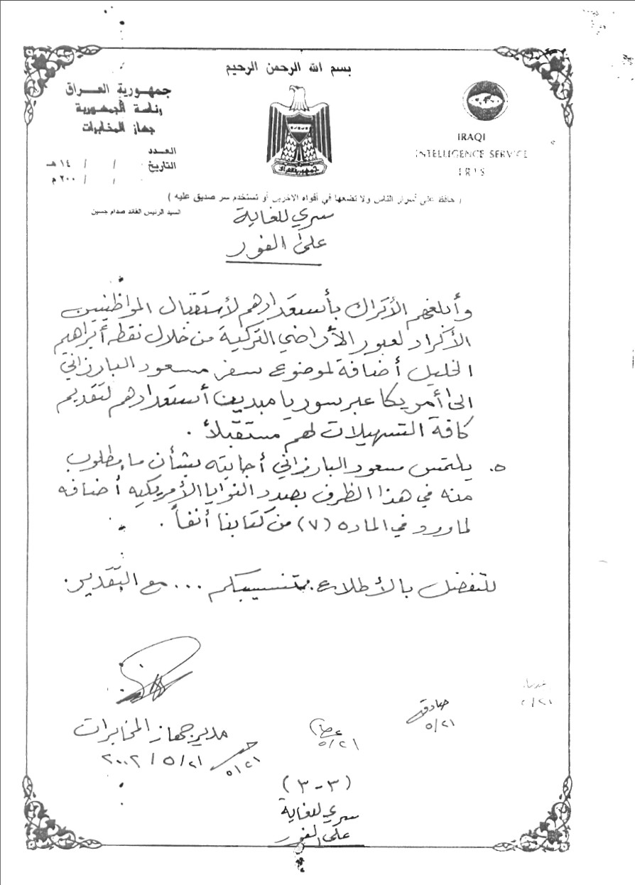 بەپێی بەڵگەیەکی دەزگای هەواڵگیری عێراق بێت کە هەڵۆ ئیبراهیم ئەحمەد بڵاویکردووەتەوە لە رۆژی 21ی ئایاری 2002، تورکەکان ئامادەی خۆیان بۆ پێشوازیکردن لە هاوڵاتییانی کورد بۆ پەڕینەوەیان لەناو خاکی تورکیا لە خاڵی ئیبراهیم خەلیل دەربڕیوە، هەروەها لەبارەی گەشتی مەسعود بارزانی بۆ ئەمریکا لە رێگەی سوریاوە ئامادەی خۆیان دەربڕیوە بۆ پێشکەشكردنی هەموو ئاسانکارییەک لە داهاتوودا، هەروەها مەسعود بارزانی داوا دەکات وەڵامی بدرێتەوە لەبارەی چی لەسەرە ئەنجامی بدات لەم دۆخەدا بەرامبەر بە نیازی ئەمریکا.