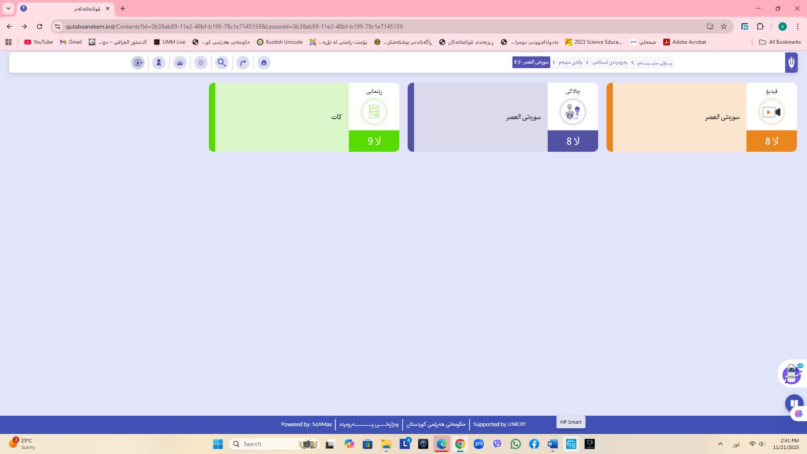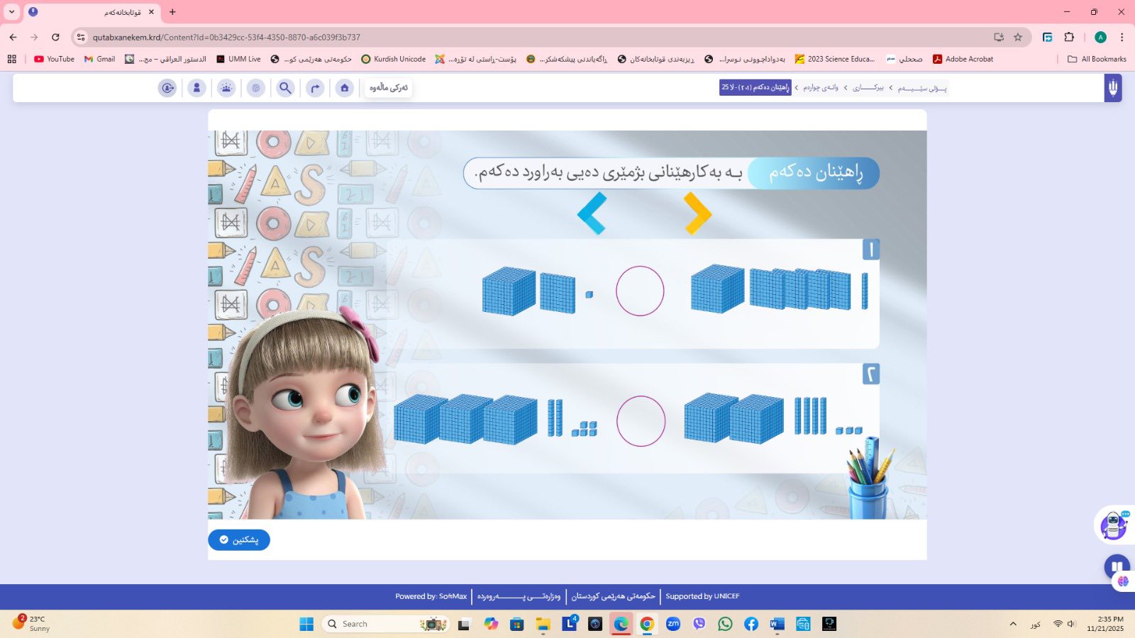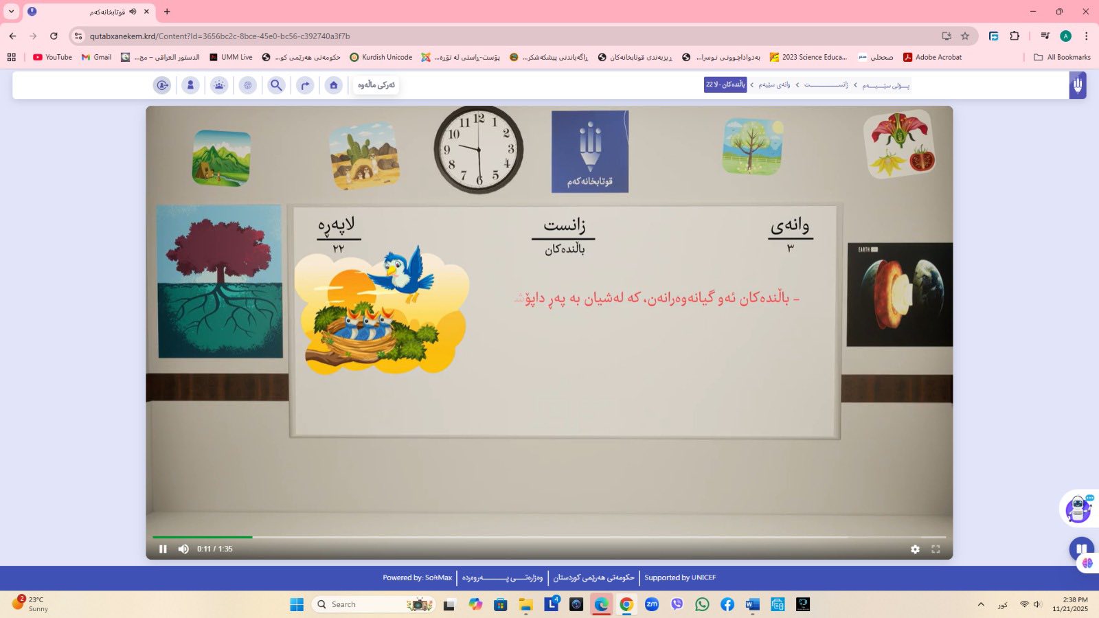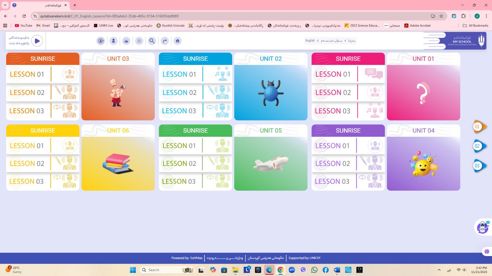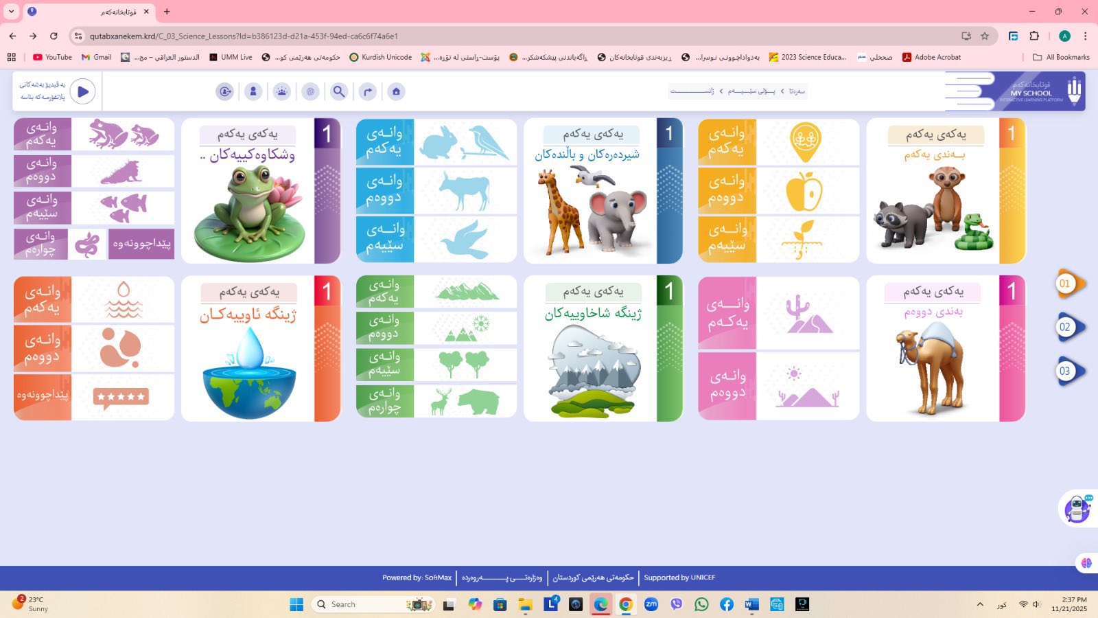 ئاماژهشی بهوهداوه كه "پلاتفۆرمی (قوتابخانهكهم) كه ئێستا سێ پۆلی خوێندنی تهواو كارایه و پۆلهكانی 4 و 5ی بنهڕهتیش لهژێركاركردندان، بۆ كۆتایی ساڵی 2026 ههموو پۆل و قۆناغهكانی خوێندنی بنهڕهتی تهواو دهكرێن، تیمی خۆماڵی و بههاوبهشی رێكخراوی یونسێف ئهنجامی دهدهین، دهبێته وهرچهرخانێكی گرنگی پرۆسهی فێربوون له كوردستان".