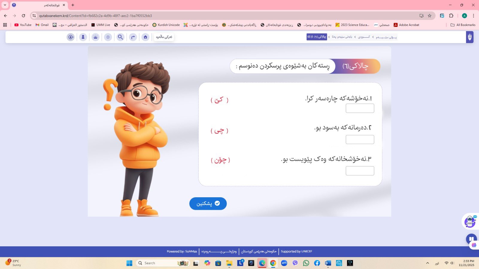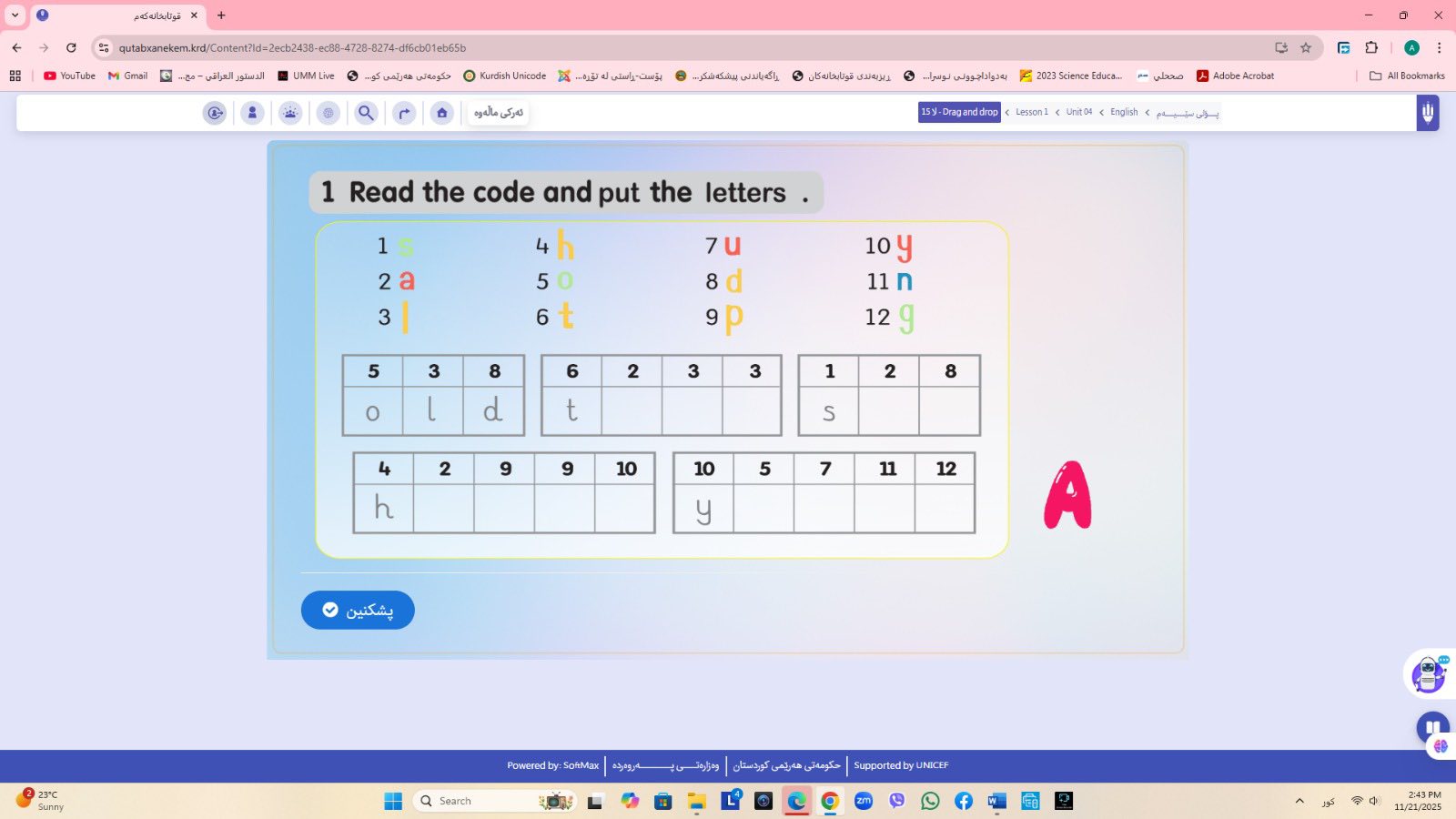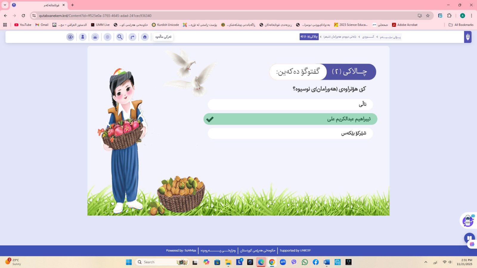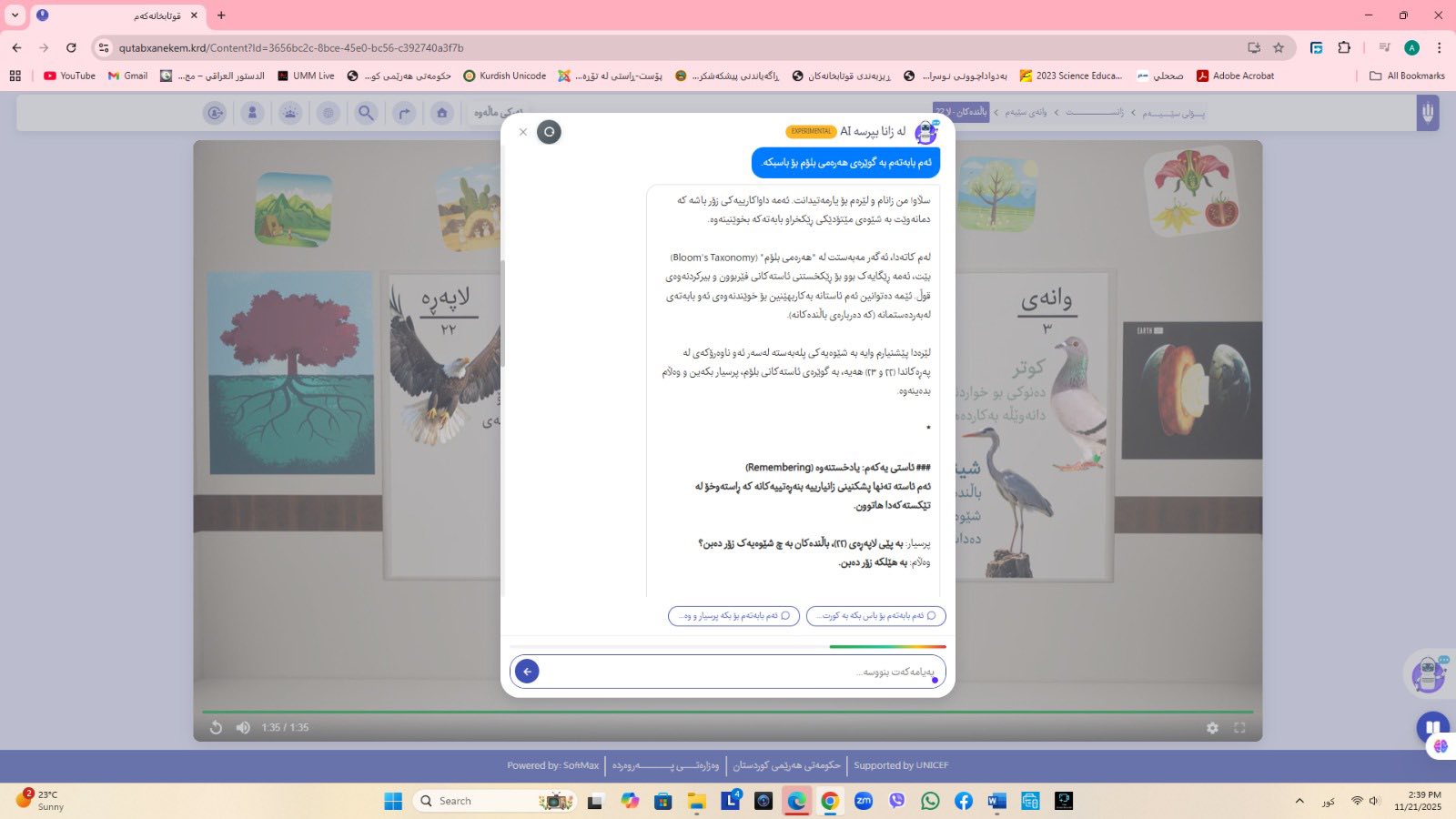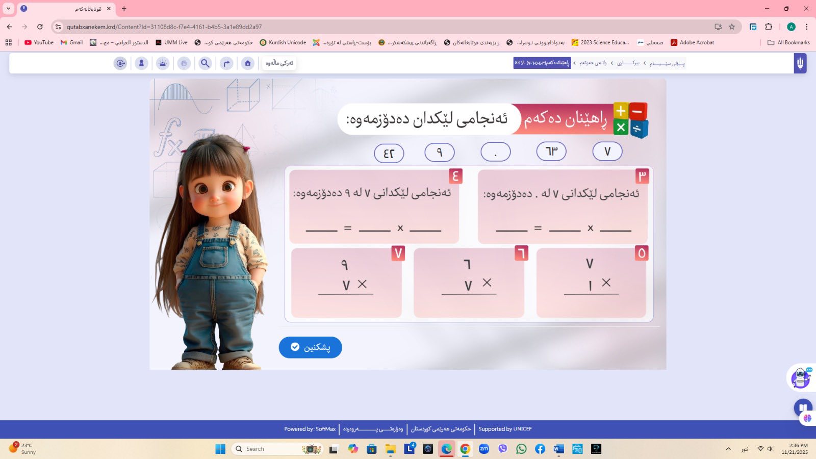 ئاماژهشی بهوهداوه كه "پلاتفۆرمی (قوتابخانهكهم) كه ئێستا سێ پۆلی خوێندنی تهواو كارایه و پۆلهكانی 4 و 5ی بنهڕهتیش لهژێركاركردندان، بۆ كۆتایی ساڵی 2026 ههموو پۆل و قۆناغهكانی خوێندنی بنهڕهتی تهواو دهكرێن، تیمی خۆماڵی و بههاوبهشی رێكخراوی یونسێف ئهنجامی دهدهین، دهبێته وهرچهرخانێكی گرنگی پرۆسهی فێربوون له كوردستان".