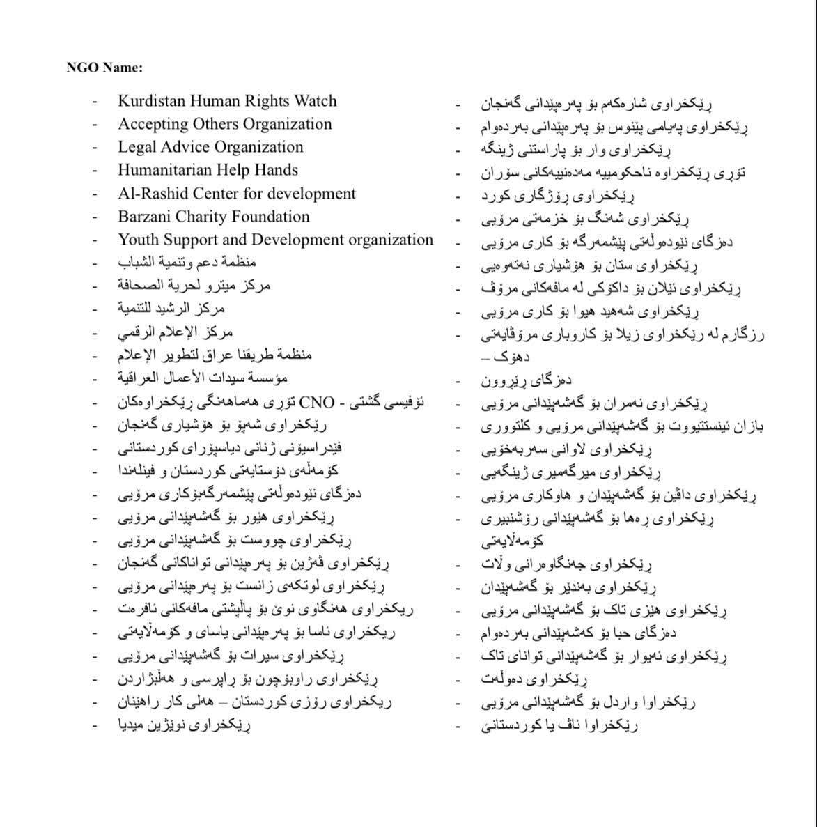 له راگهیهندراوهكهدا هاتووه كه "ئێمه، كۆمهڵێك له ڕێكخراوهكانی كۆمهڵی مهدهنی له كوردستان و له عیراق، دهنگی خۆمان یهكدهخهین، داوا دهكهین حكومهتی فیدراڵی و حكومهتی ههرێمی كوردستان دهستبهجێ ههنگاو كرداری بنێن، بۆ ئهوهی ڕاستیهكان بۆ خهڵك ئاشكرا بكهن و لێپرسینهوه له ههموو ئهو كهسانه بكهن كه ئهم كاره تاوانكارییهیان ئهنجامداوه بۆ ئهوهی ئهمجۆره كردارانه دووباره نهبنهوه".