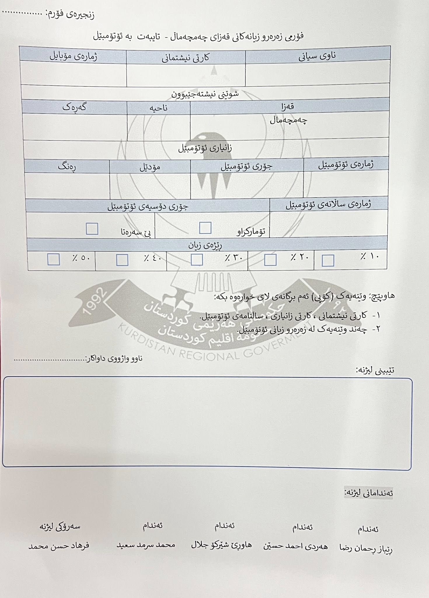 ئهمڕۆ پێنجشهممه 11ی كانوونی یهكهمی 2025 رهمك رهمهزان قائیمقامی چهمچهماڵ به نووسراوی ژماره 4422 و بهفهرمانی نووسینگهی قوباد تاڵهبانی جێگری سهرۆك وهزیران بڕیاری پێكهێنانی لیژنهیهكی دا بهمهبهستی تۆماركردنی ئهو ئۆتۆمبێلانهی كه بههۆی لافاوی رۆژی 2025/12/9 زهرهرمهند بوون.