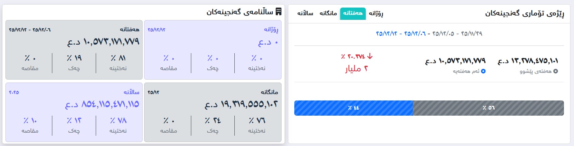 ماڵپهڕی شهفافیهت بڵاویكردهوه كه داهاتی یهك ههفتهی سلێمانی له رۆژی 6ی كانوونی یهكهم تا ئهمڕۆ 12ی كانوونی یهكهمی 2025، بڕی 10 ملیار و 573 ملیۆن و 171 ههزار و 779 دینار بووه.