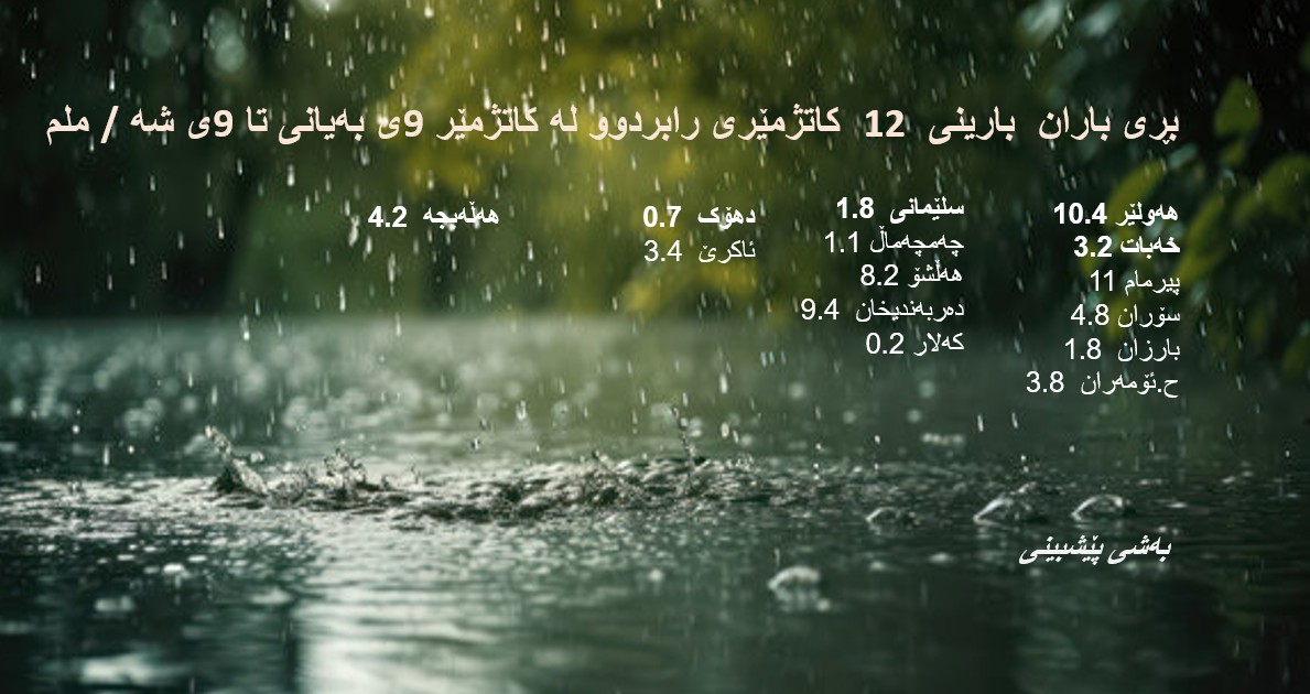 ئهمهش بڕی باران بارینی 12 كاتژمێری رابردووی ههندێك لهناوچهكانی ههرێمه: