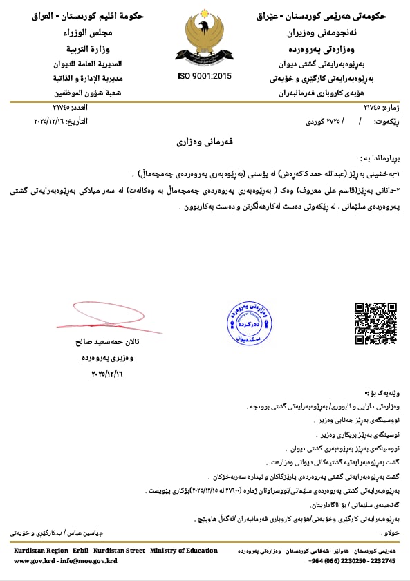 ههر له ههمان فهرمانی وهزاریدا بڕیاردراوه به دانانی (قاسم عهلی مهعروف) بۆ پۆستی بهڕێوهبهری پهروهردهی چهمچهماڵ به وهكالهت لهسهر میلاكی بهڕێوهبهرایهتی گشتی پهروهردهی سلێمانی.