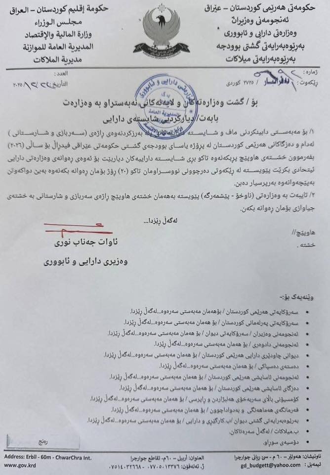 له نووسراوێكی وهزارهتهدا كه به ئیمزای ئاوات جهناب نوری، وهزیری دارایی و ئابووری دهرچووه، گشتاندن بۆ سهرجهم وهزارهت و لایهنه نهبهستراوهكان به وهزارهت كراوه سهبارهت به دابینكردنی ماف و شایسته داراییهكانی پهیوهست به پلهبهرزكردنهوهی (سهربازی و شارستانی) فهرمانبهرانی ههرێمی كوردستان له چوارچێوهی پڕۆژهیاسای بودجهی گشتیی عێراق بۆ ساڵی 2026.