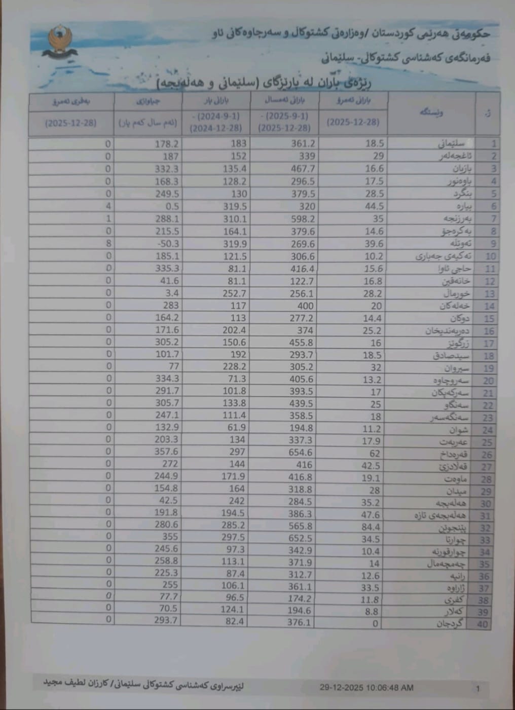 فەرمانگەی کەشناسیی کشتوکاڵی سلێمانی رێژەی بارانبارینی ئەمساڵ و ساڵی رابردووی لە ناوچەکانی سنووری هەردوو پارێزگای سلێمانی و هەڵەبجەی بڵاوکردەوە.