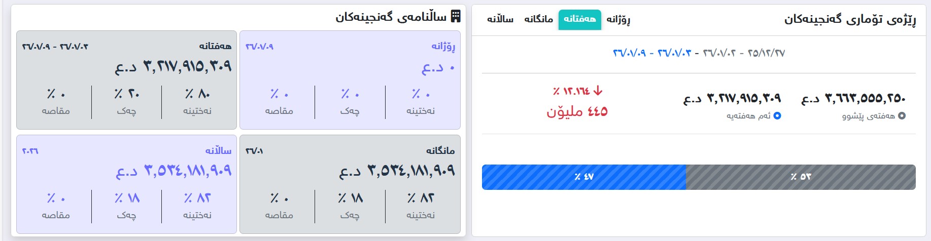 ماڵپهڕی شهفافیهت بڵاویكردهوه كه داهاتی یهك ههفتهی سلێمانی له رۆژی 3ی كانوونی دووهم تا ئهمڕۆ 9ی كانوونی دووهمی 2026، بڕی 3 ملیار و 217 ملیۆن و 915 ههزار و 309 دینار بووه.