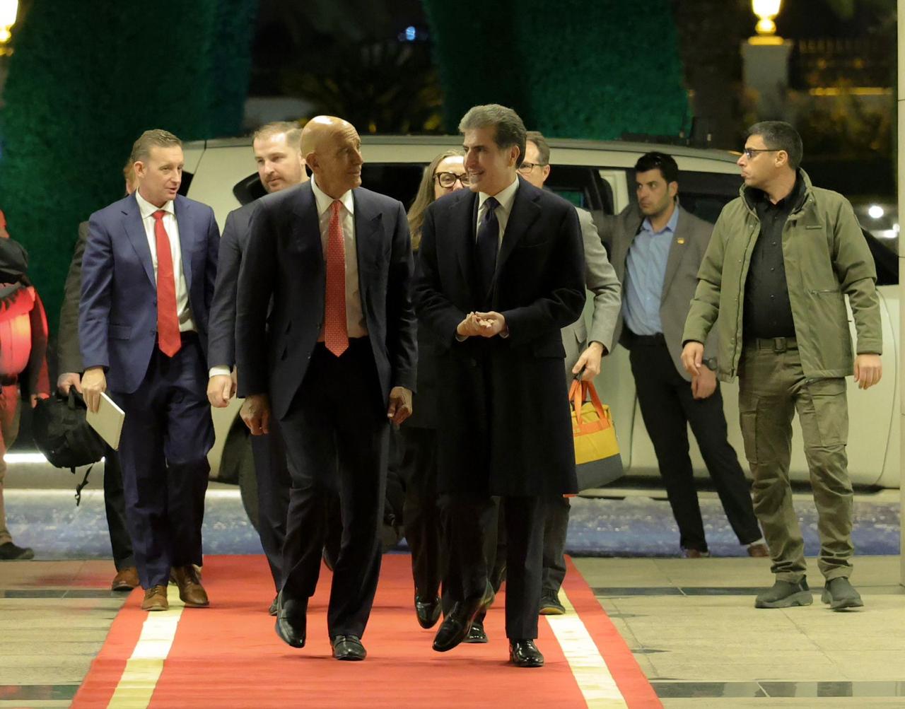 ئێوارهى ئهمڕۆ شهممه 17ی کانونی دووەمی 2026، نێچيرڤان بارزانى، سهرۆكى ههرێمى كوردستان، پێشوازيى له تۆم باراك، نوێنهرى دۆناڵد ترهمپ بۆ كاروبارى سوريا و باڵيۆزى ئهمهريكا له توركيا و شاندێكى ياوهرى كرد.