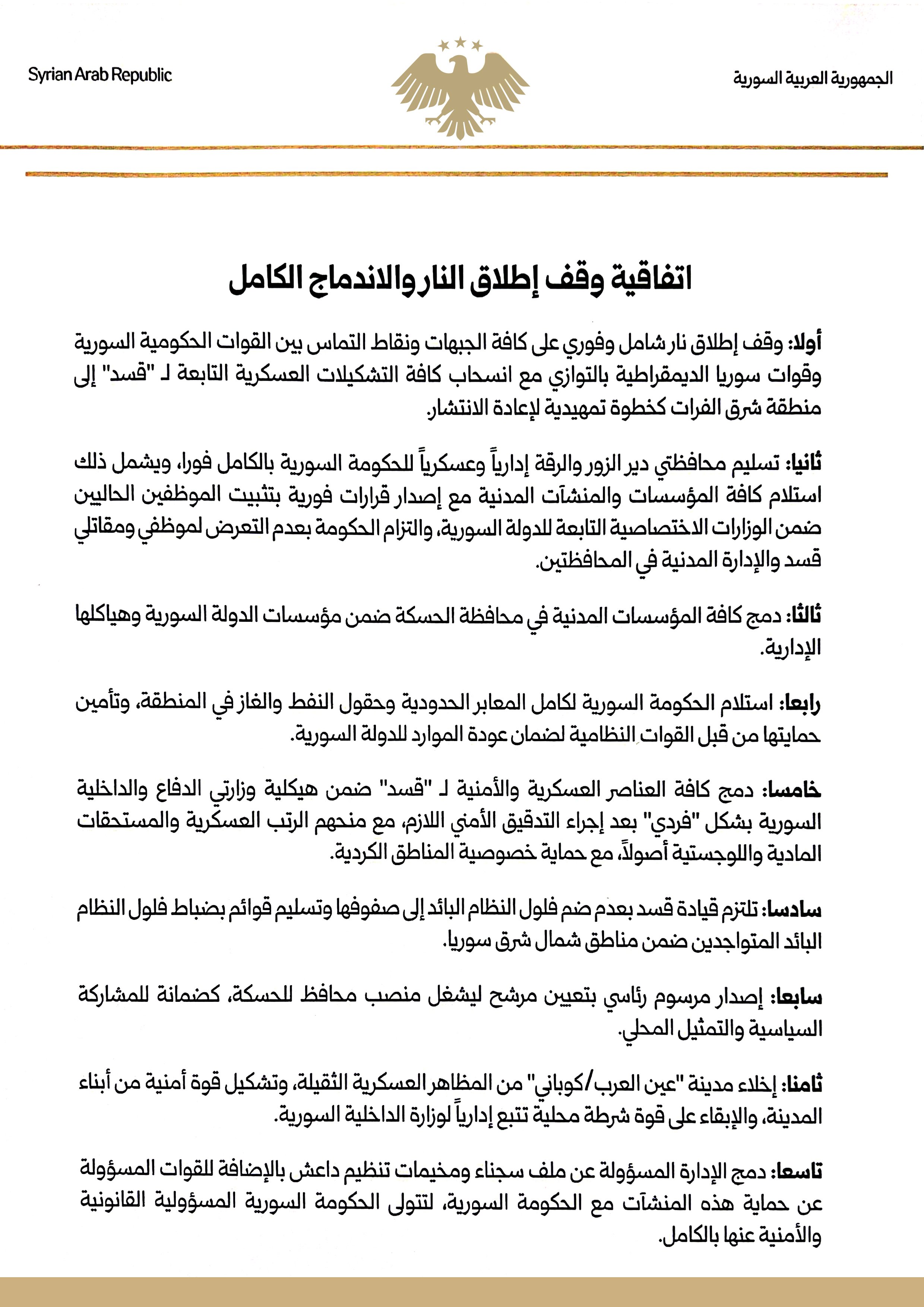 یهكهم: ئاگربهستێكی دهستبهجێ و گشتگیر له ههموو بهرهكان و هێڵهكانی بهریهككهوتن له نێوان هێزهكانی حكومهتی سووریا و هێزهكانی سووریای دیموكرات (ههسهده)، لهگهڵ كشانهوهی ههموو پێكهاته سهربازییهكانی ههسهده بۆ رۆژههڵاتی رووباری فورات وهك ههنگاوێكی سهرهتایی بۆ دووباره بڵاوبوونهوه.