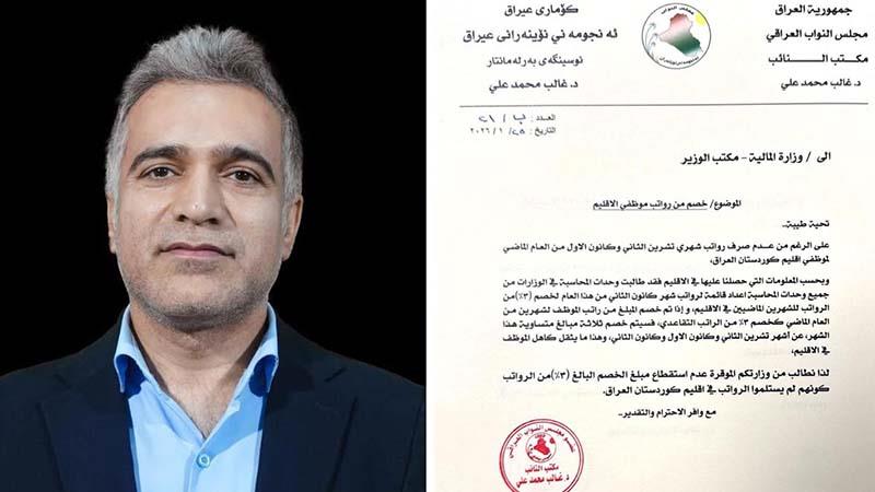 ئهو پهرلهمانتاره دهڵێت: "سهرهڕای ئهوهی مووچهی مانگهكانی 11 و 12ی پارساڵ نهدراوه، بهڵام ههرێم دهیهوێت لهسهدا (3%) خانهنشینی ئهو مانگانه له مووچهی مانگی 1 دا ببڕێت".