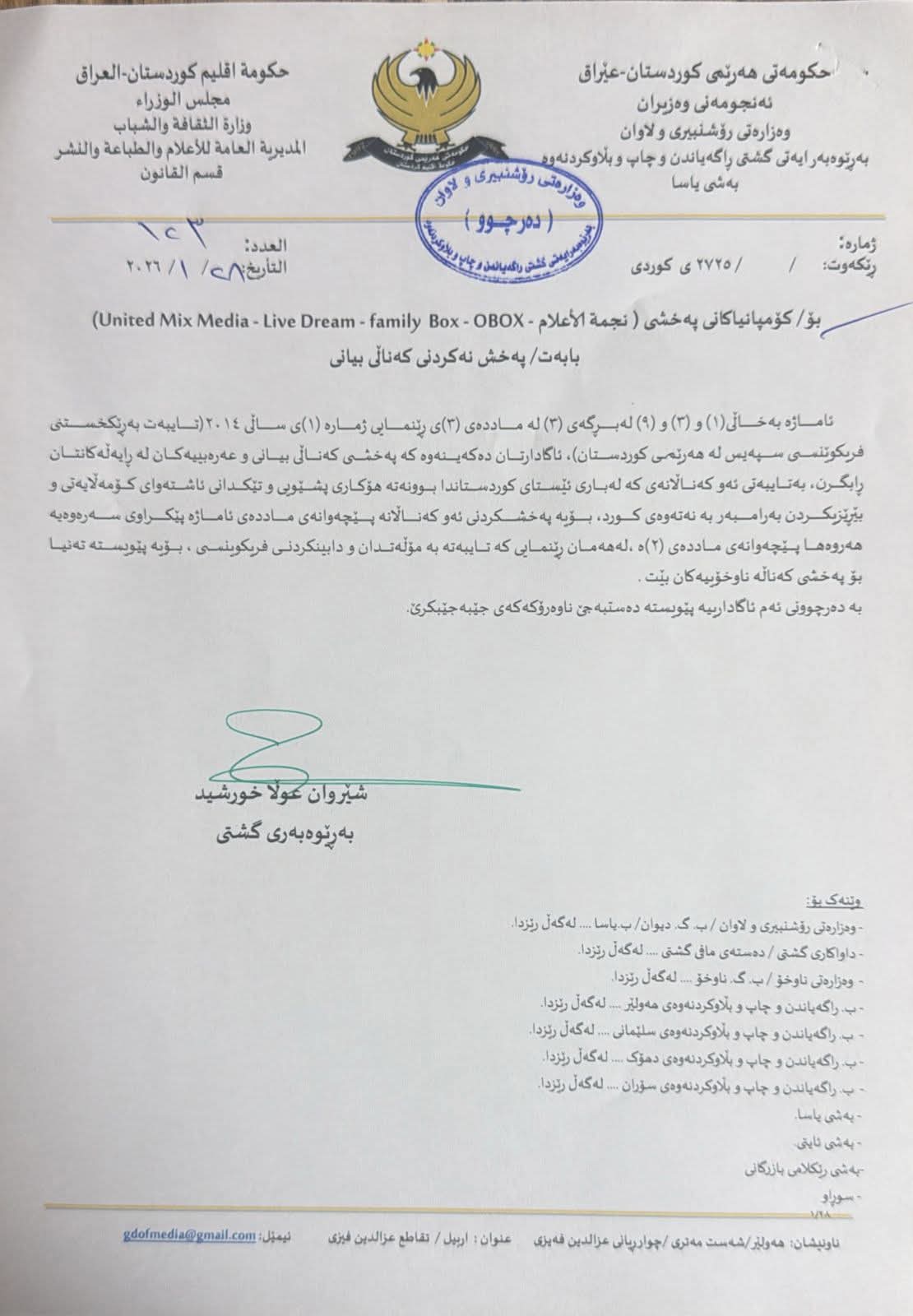 وەزارەتی رۆشنبیری و لاوانی حکومەتی هەرێمی کوردستان، بە بڕیار داوا لە هەریەکە لە کۆمپانیاکانی پەخشی (united mix media, live dream, family box ,obox)، پەخشی کەناڵە عەرەبییەکان و رایەڵەکانیان رابگرن.