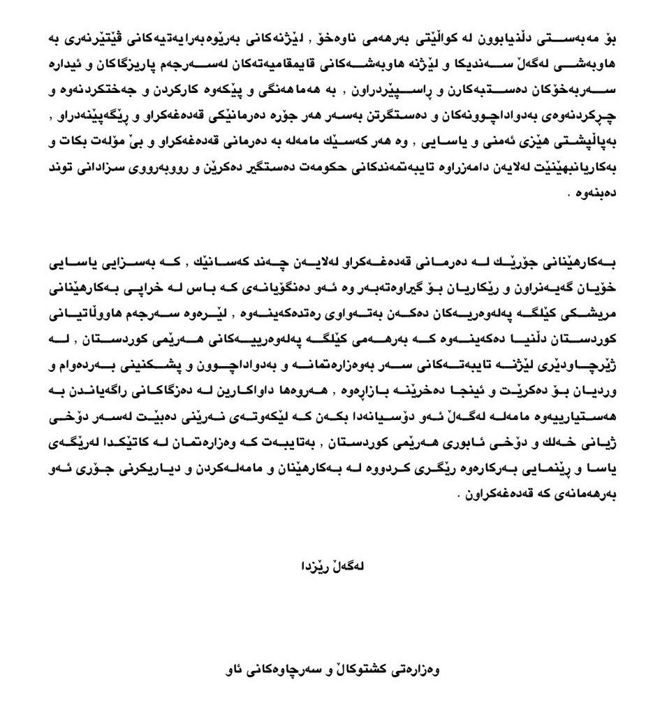 ئهمڕۆ پێنجشهممه وهزارهتی كشتوكاڵ و سهرچاوهكانی ئاوی ههرێم بهیاننامهیهكی ئاراستهی رای گشتی و دهزگاكانی راگهیاندن كرد و تیایدا هاتووه: