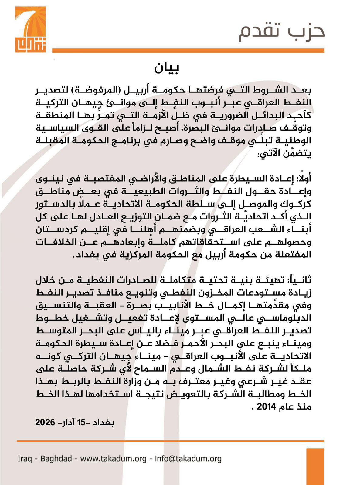 دوای ئهوهی ههولێر ههناردهكردنی نهوتی لهڕێی بۆری نهوتی جهیهان رهتكردهوه، حزبی تهقهدومی سوننه كه لهلایهن محهمهد حهلبوسی-یهوه سهرۆكایهتی دهكرێت داوا له حكومهتی فیدراڵی دهكات سامانهكانی عێراق بپارێزێت و كێڵگه نهوتییهكانی كهركوك و موسڵ و بۆری نهوتی جهیهان كۆنترۆڵ بكاتهوه.