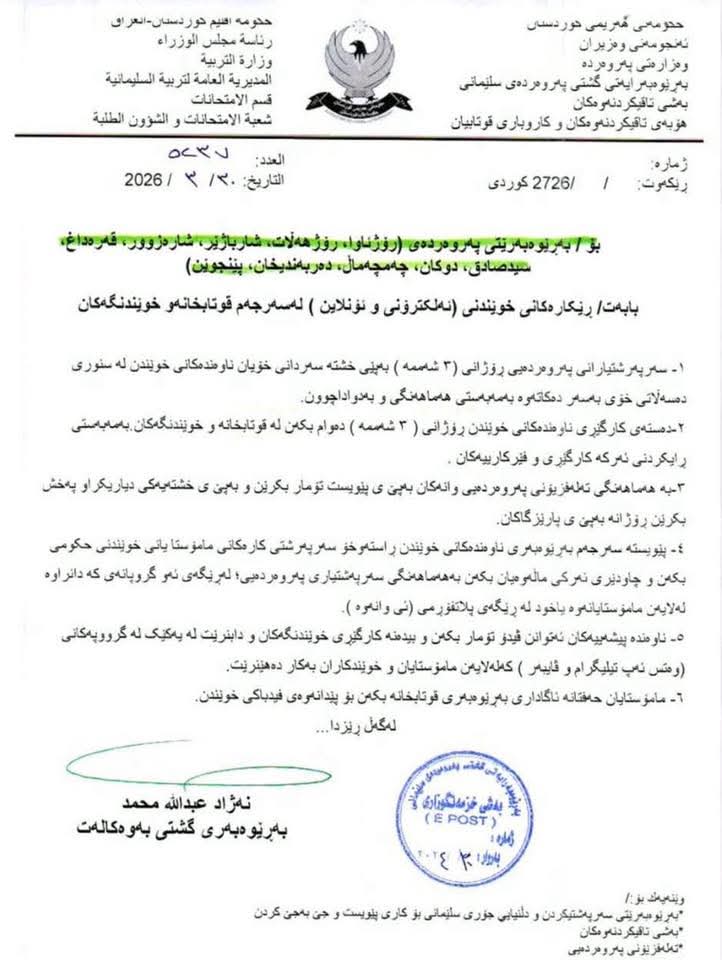 ئەمڕۆ دووشەممە 30ی ئاداری 2026، بەڕێوەبەرایەتیی گشتیی پەروەردەی سلێمانی ڕێکارەکانی تایبەت بە پرۆسەی خوێندنی ئەلیکترۆنی و ئۆنلاینی لە سەرجەم قوتابخانە و خوێندنگەکان بڵاوکردەوە.