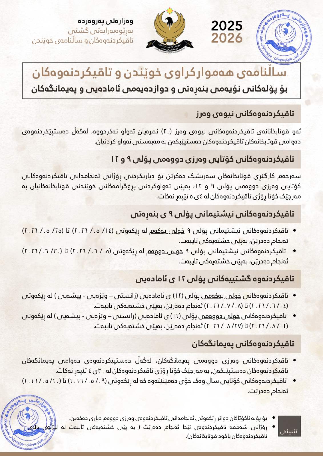 حکومەتی هەرێمی کوردستان ساڵنامەی هەموارکراوی خوێندن و تاقیکردنەوەکانی بۆ ساڵی 2025- 2026 بڵاوکردەوە.