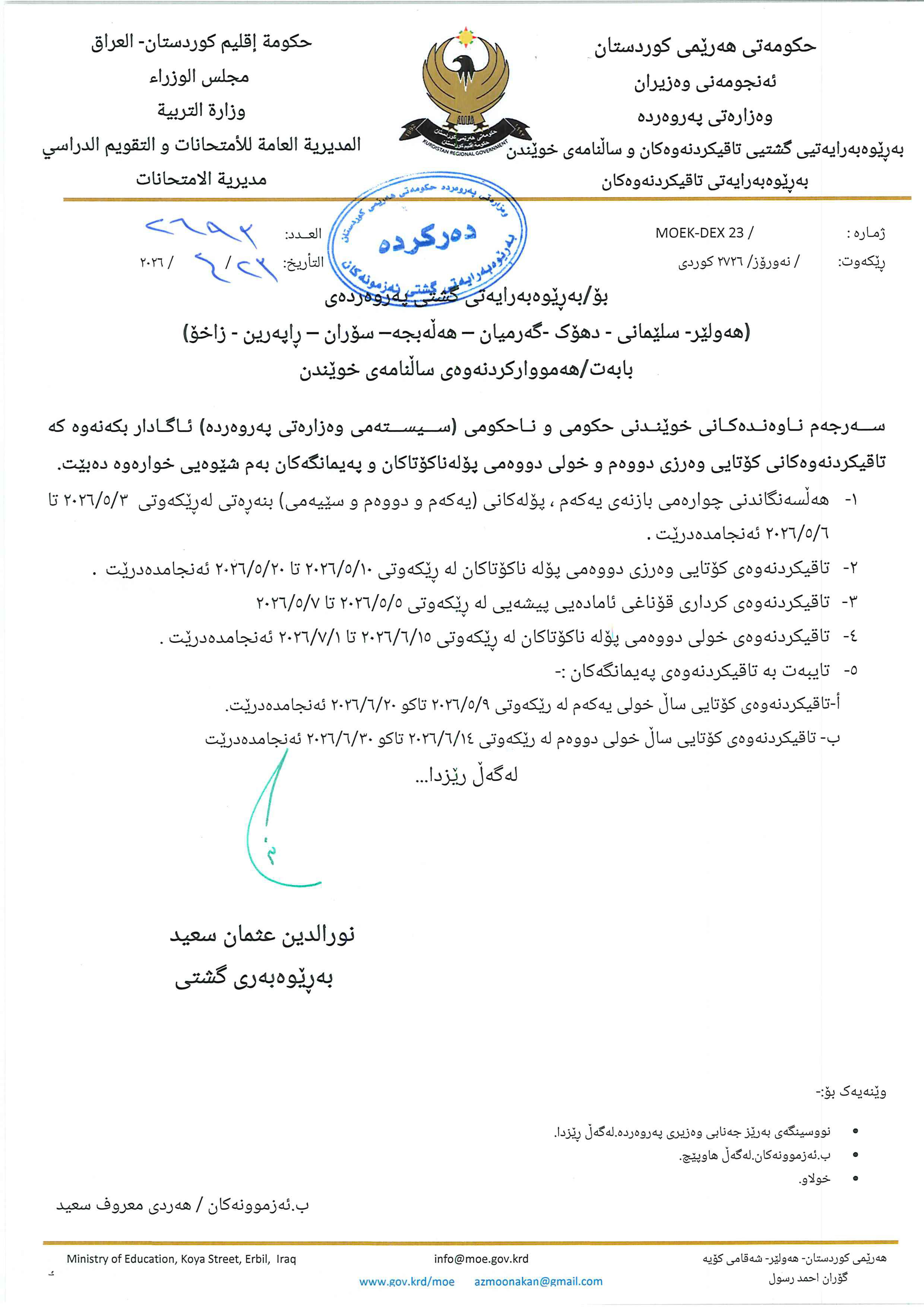 ئهمڕۆ پێنجشهممه وهزارهتی پهروهردهی ههرێم به نوسراوێك ههمواركردنهوهی ساڵنامهی خوێندنی ئاراستهی بهڕێوهبهرایهتی گشتی پهروهردهی (ههولێر - سلێمانی - دهۆك - گهرمیان - ههڵهبجه - سۆران - ڕاپهڕین - زاخۆ) كرد و تیایدا هاتووه كه سهرجهم ناوهندهكانی خوێندنی حكومی و ناحكومی (سیستهمی وهزارهتی پهروهرده) ئاگادار بكهنهوه كه تاقیكردنهوهكانی كۆتایی وهرزی دووهم و خولی دووهمی پۆله ناكۆتاكان و پهیمانگهكان بهم شێوهیهی خوارهوه دهبێت: