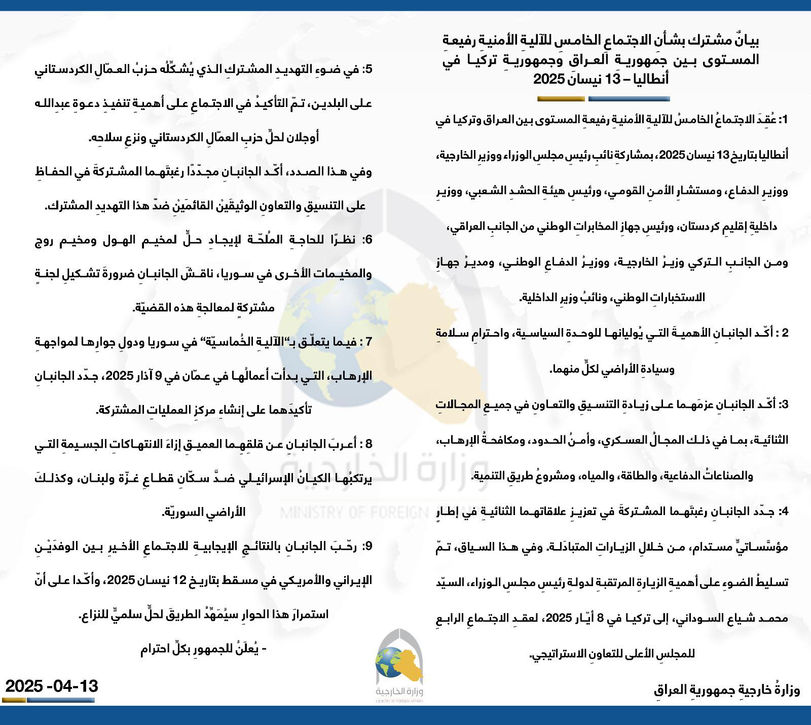 ئهمڕۆ یهكشهممه 13ی نیسانی 2025 وهزارهتی دهرهوهی عێراق دهقی راگهیهندراوێكی هاوبهشی سهبارهت به پێنجهمین كۆبوونهوهی میكانیزمی ئهمنیی ئاستی باڵای نێوان عێراق و توركیای بڵاوكردهوه كه تیایدا ههردوولا جهخت له جێبهجێكردنی پهیامهكهی عهبدوڵا ئۆجهلان رێبهری زیندانیكراوی پارتی كرێكارانی كوردستان دهكهنهوه.