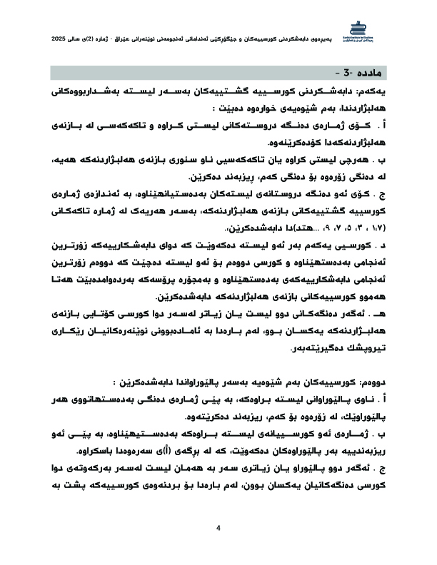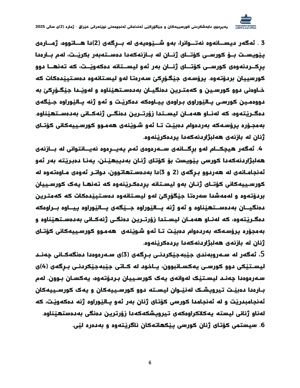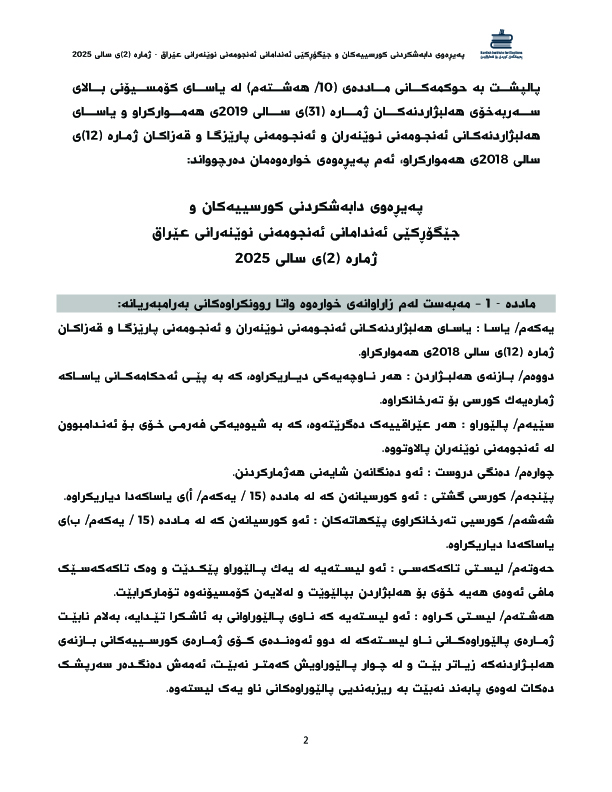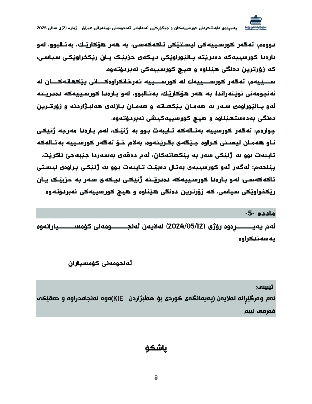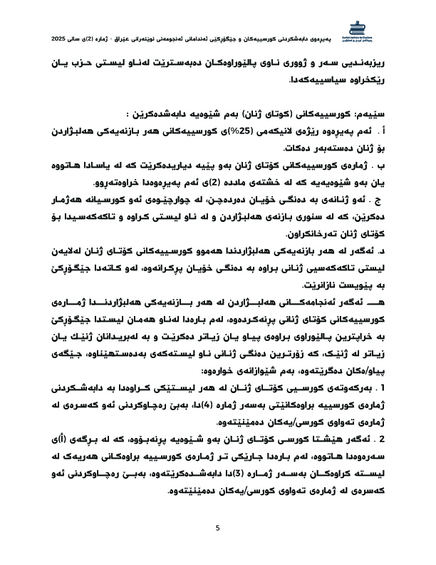 ئارام جهمال، توێژهر و شارهزای بواری ههڵبژاردن له پهیمانگای كوردی بۆ ههڵبژاردن، پهیڕهوی دابهشكردنی كورسییهكان و جێگۆڕكێی ئهندامانی ئهنجومهنی نوێنهرانی عێراق ژمارهی 2ی ساڵی 2025ی بڵاوكردهوه.