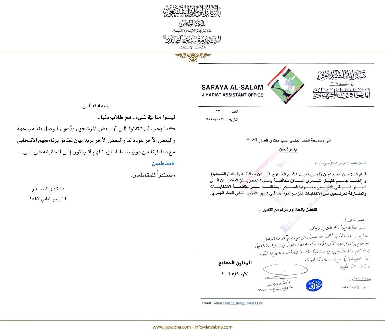 ئەمڕۆ سێشەممە 7ی تشرینی دووەمی 2025، موقتەدا سەدر، سەركردەی رەوتی نیشتیمانی شیعە، چاوی خشاندەوە بە چالاكییەكانی سەرایا سەلام، كە ناوی چەند كەسێكی لەخۆگرتبوو، سەر بە رەوتی نیشتیمانی شیعەن، بەڵام سەرپێچی بڕیاری بایكۆتیان كردووە و خۆیان كاندید كردووە بۆ هەڵبژاردنەكانی عێراق.