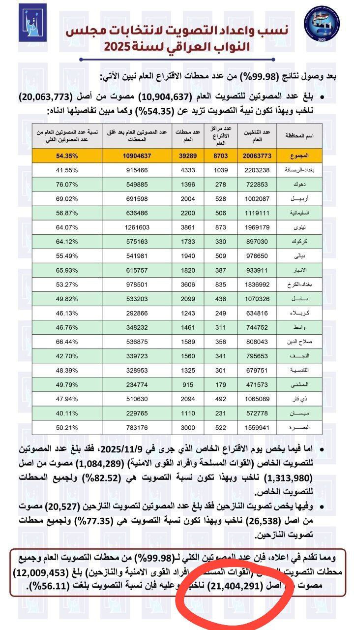 بهپێی ئاماره فهرمییهكانی كۆمسیۆنی باڵای ههڵبژاردنهكانی عێراق لهنێوان ههردوو ههڵبژاردنی 2021 و 2025ی ئهنجومهنی نوێنهران، زیاتر له 712 ههزار دهنگدهر له كهمیكردووه سهرهڕای لهدایكبووانی چوار ساڵ.