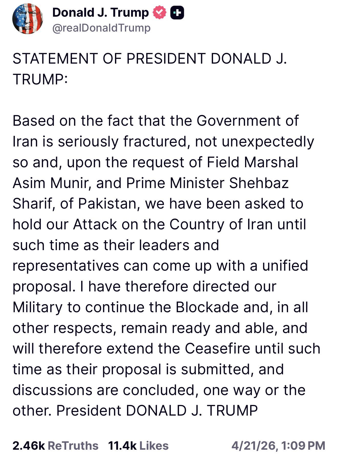 دۆناڵد ترهمپ، سهرۆكی ویلایهته یهكگرتووهكانی ئهمریكا، بڕیاریدا وادهی ئاگربهست لهگهڵ كۆماری ئیسلامیی ئێران درێژ بكاتهوه.