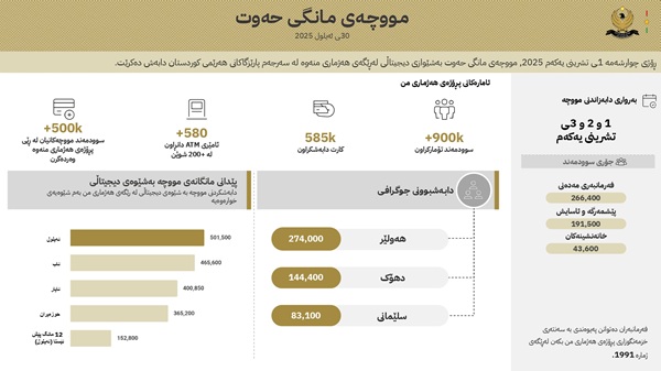 تیمی پرۆژهی "ههژماری من" راگهیاند كە سبهی چوارشهممه 1ی تشرینی یهكهمی 2025، مووچهی مانگی حهوت (تهمموز)ـی مووچهخۆرانی ههرێم، له ڕێگهی پرۆژهی ههژماری منهوه دابهش دهكرێت.