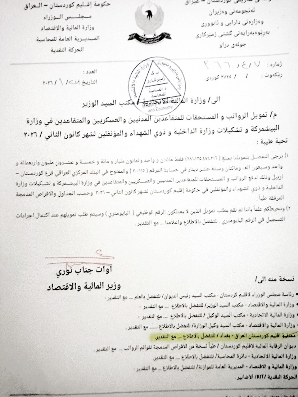 ٣- بهپێی نووسراوی ژماره( ٣٦٦ ) له بهرواری ( ٢٠٢٦/١/٢٧ ) داوای خهرجكردنی بڕی ( ٢٨١،١٢٥،٤٧١،٢١٦ ) دووسهد و ههشتا و یهك ملیار و سهد و بیست و پێنج ملیۆن و چوارسهد و حهفتا و یهك ههزار و دووسهد و شازده دینارمان بۆ مووچهی مانگی كانوونی دووهمی خانهنشینانی شارستانی و سهربازی خهرج كردووه، كه بڕی ٣٦ ملیارهكهشی لهگهڵه، بهڵام وهزارهتی دارایی عێراق تهنها بڕی ( ٢٤٤،٧٦٤،٦٠٦،٣٥٧ ) دوو سهدو چل و چوار ملیار و حهوت سهد و شهست و چوار ملیۆن و شهش سهد و شهش ههزار و سێ سهد و پهنجا و حهوت دیناری وهك تهمویلی مووچهی مانگی كانوونی دووهمی خانهنشینانی شارستانی و سهربازی ناردووه.