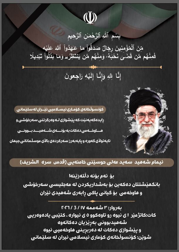 اعلنت القنصلية العامة للجمهورية الاسلامية الايرانية في السليمانية عن اقامة مجلس عزاء في محافظة السليمانية في اقليم كردستان للمرشد الايراني السيد علي خامنئي.