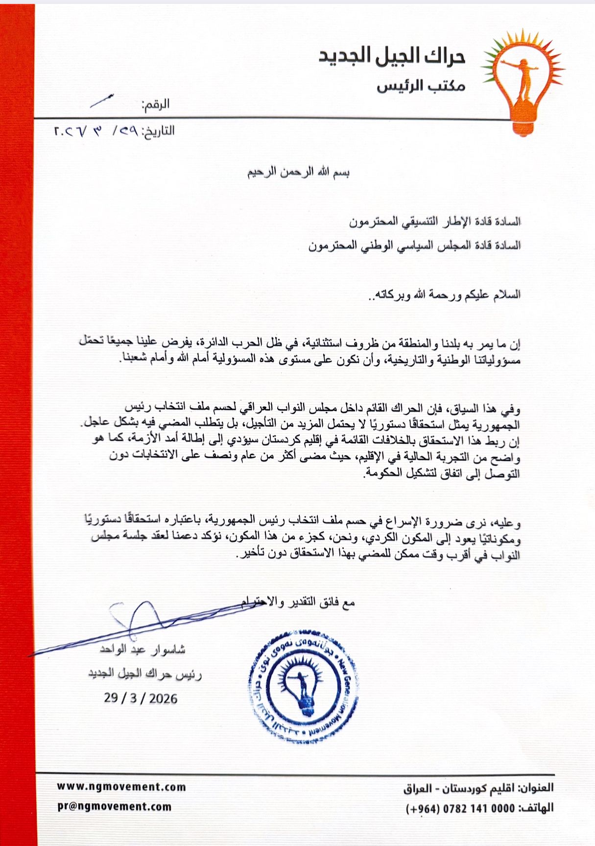 طالب رئيس الحزب الديمقراطي الكردستاني مسعود بارزاني بتأجيل انتخاب رئيس الجمهورية، فيما دعا رئيس حراك الجيل الجديد شاسوار عبدالواحد الى الاسراع في حسمه.