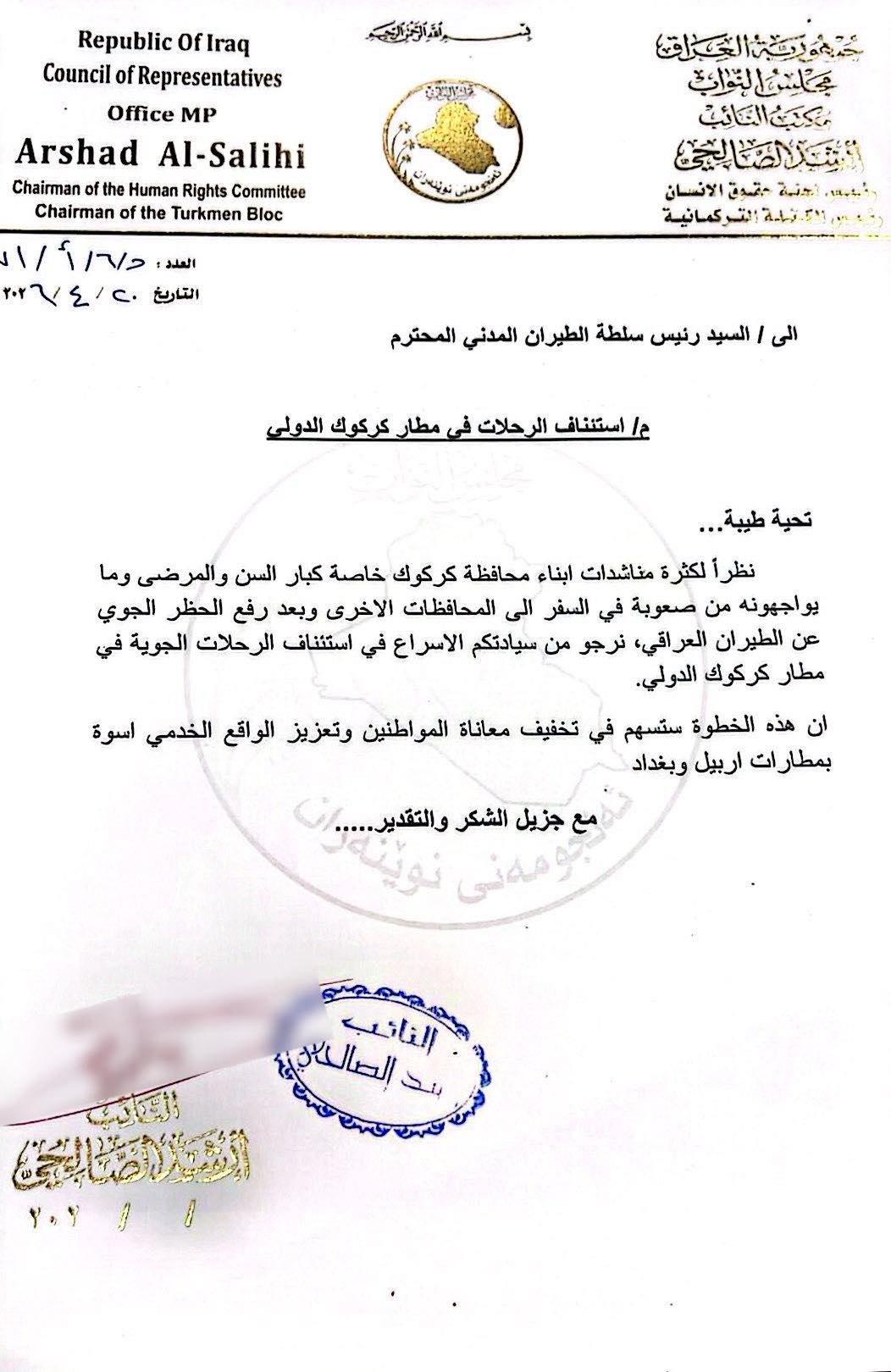 وقال مكتبه الاعلامي في بيان انه "بناءً على مناشدات مواطني كركوك الكرام، ولاسيما للحالات الإنسانية،أجرى النائب أرشد الصالحي اتصالاً مع رئيس سلطة الطيران المدني، حيث تبيّن أنه بعد رفع الحظر الجوي، لم يتبقَّ سوى بعض الإجراءات الفنية لدى الخطوط الجوية العراقية".