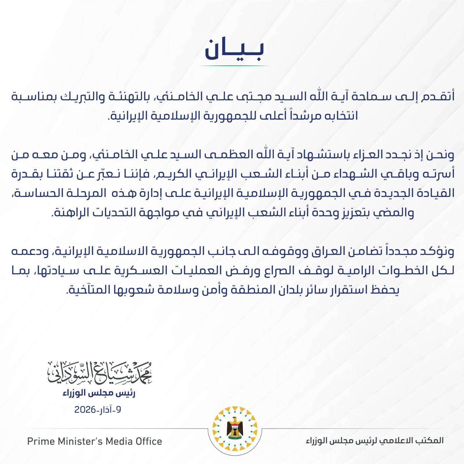 قدم رئيس الوزراء العراقي محمد شياع السوداني اليوم الاثنين تهانيه الى مجتبى علي الخامنئي بمناسبة انتخابه مرشداً أعلى للجمهورية الإسلامية الإيرانية.