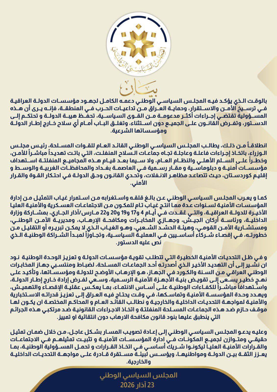 طالب المجلس السياسي الوطني، اليوم الاثنين القائد العام والمحاكم المختصة باتخاذ الاجراءات القانونية ضد الجماعات المسلحة المنفلتة.